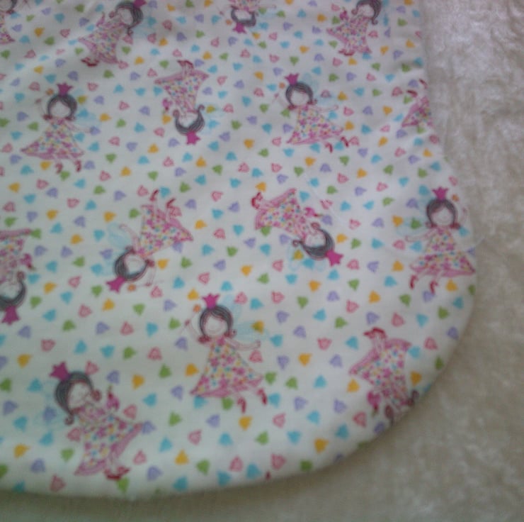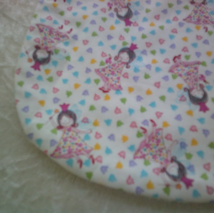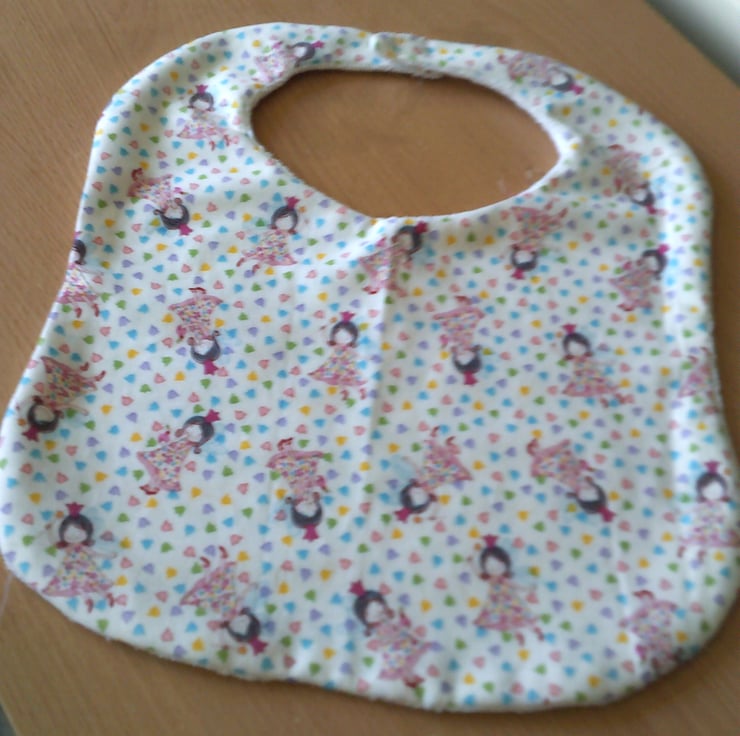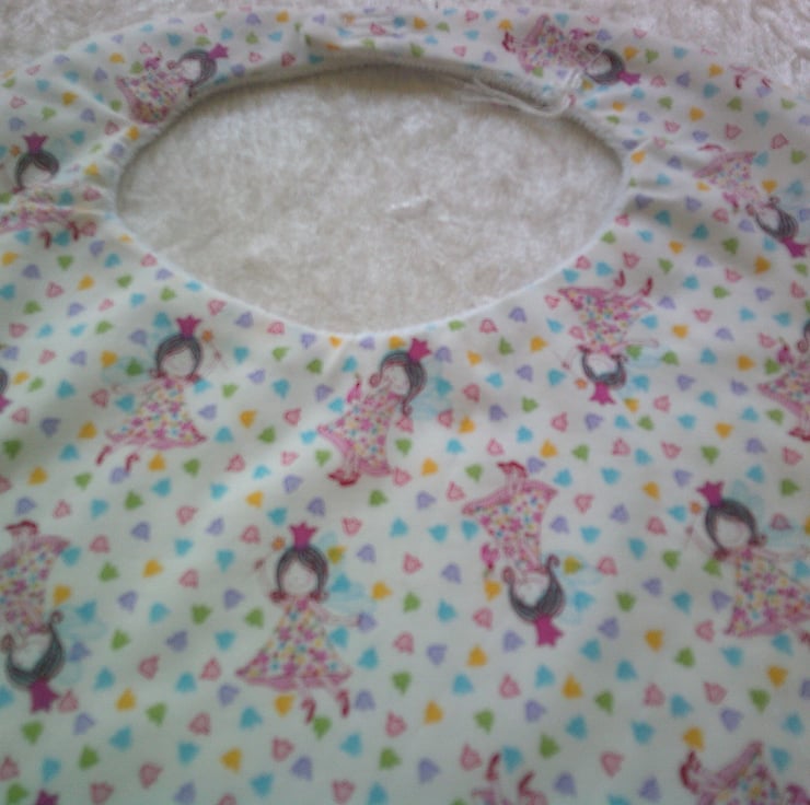 The design on the fabric used is of princess fairies and tiny flowers on a white background. It is backed with Stretch Terry Towelling with a Velcro fastening at the neck so it is easy to put on and take off before and after feeding baby.