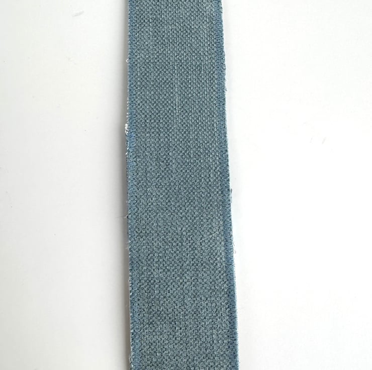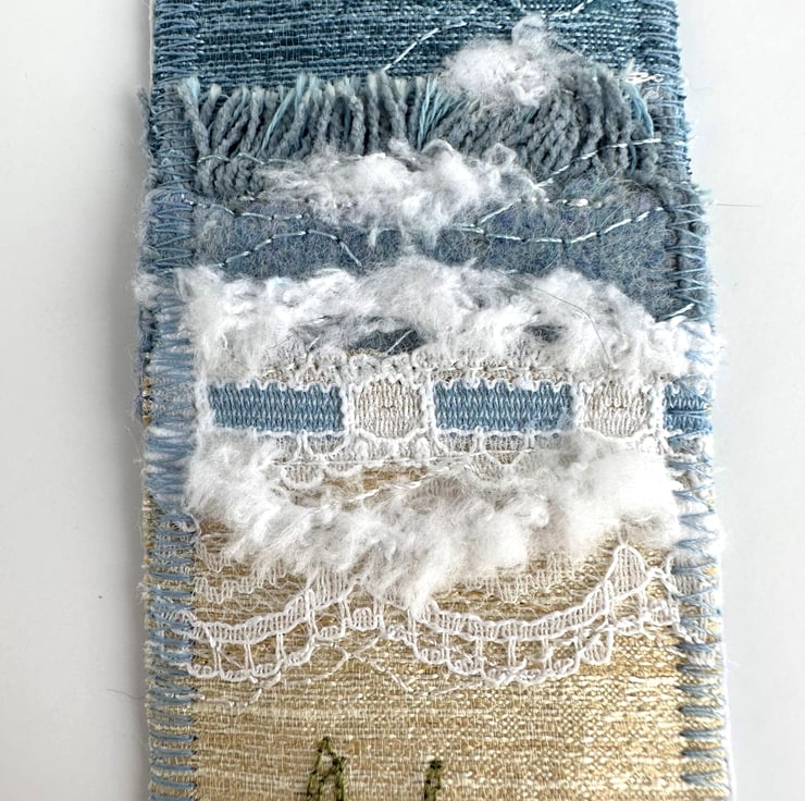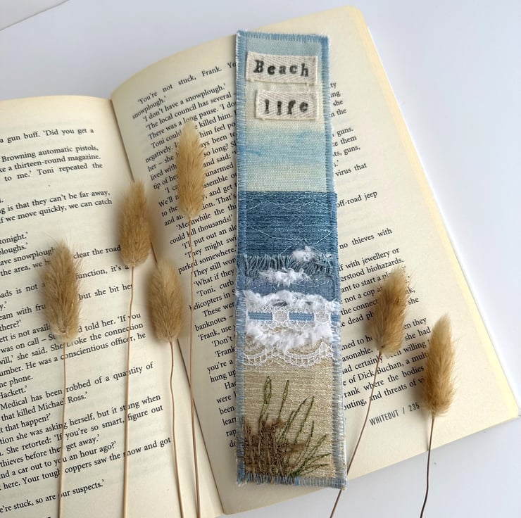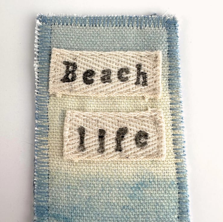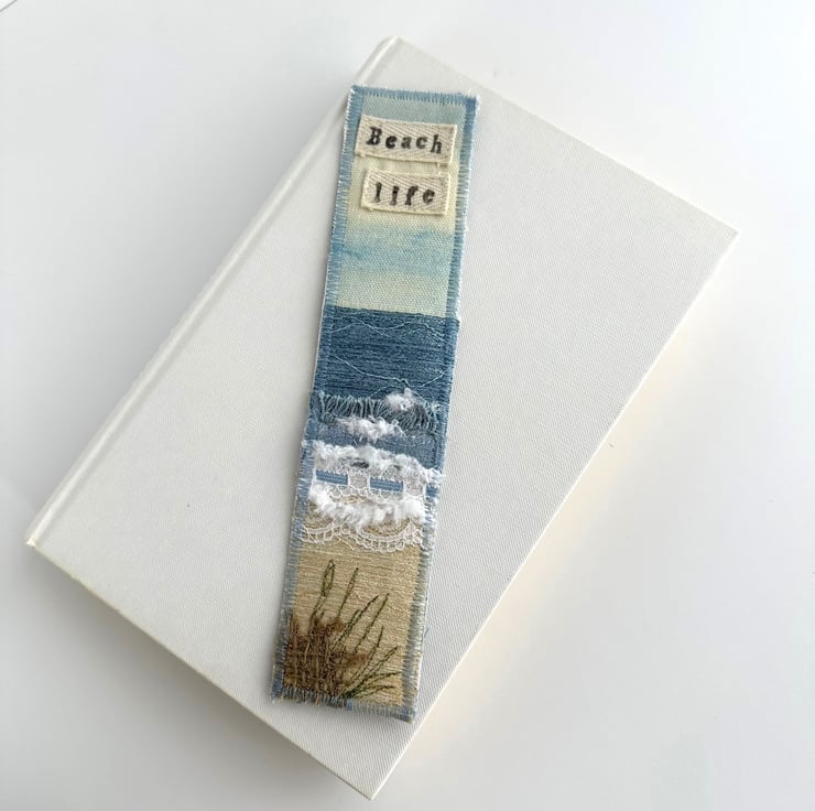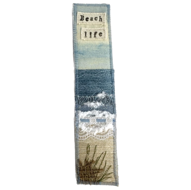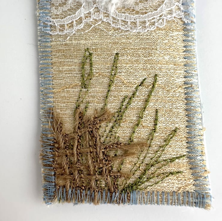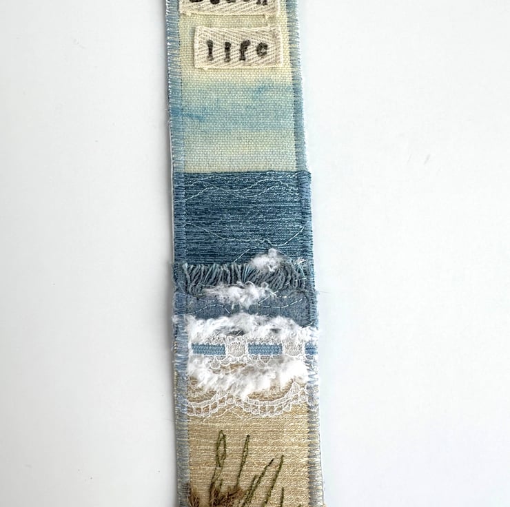 This delightful beach themed bookmark has been made from a variety of fabrics and haberdashery scraps, and has then been free-motion embroidered. It features waves breaking onto a sandy beach under a partly cloudy sky, and is depicted in shades of blue, cream, white, brown and olive green. The sky is made from a lovely pale blue and cream print fabric. For the sea, I've used blue fabrics, fluffy yarn, two types of lace, and some fabric selvedge. The sand is made from golden cream fabric. The sea and sand features free-motion embroidered detailing. In the foreground of the beach, I've added a piece of hessian in front of some free motion embroidered olive green grass. I’ve also added a piece of cream twill ribbon to the top of the bookmark, on which I’ve hand-stamped the words “Beach life” in black ink (this has then been ironed to make it water-resistant). The bookmark is backed with pale blue upholstery fabric, stiffened with an inner layer of interfacing, and edged with zig-zag stitching in blue thread.