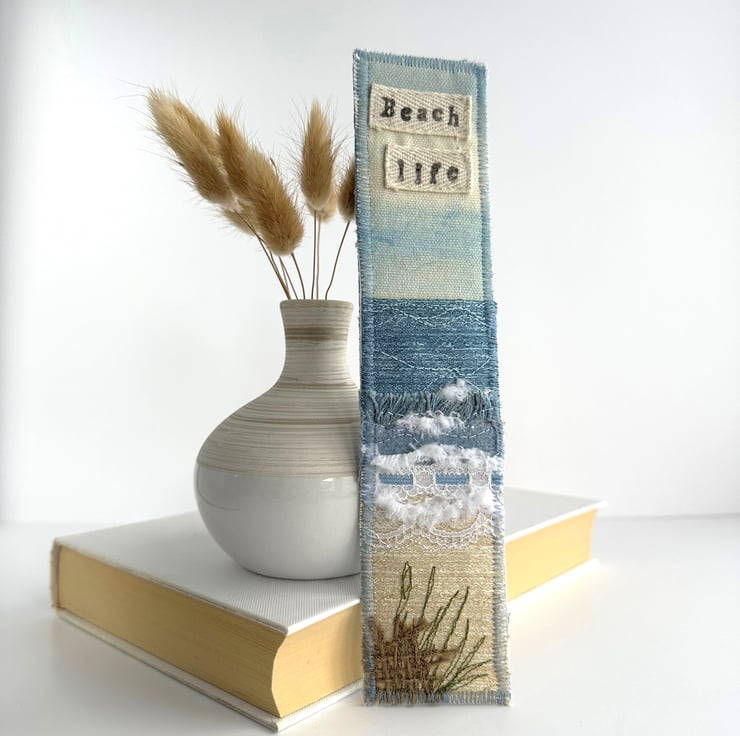 This delightful bookmark is an inexpensive way of owning a piece of textile art. It would make an ideal gift for anyone who loves reading and loves the sea.