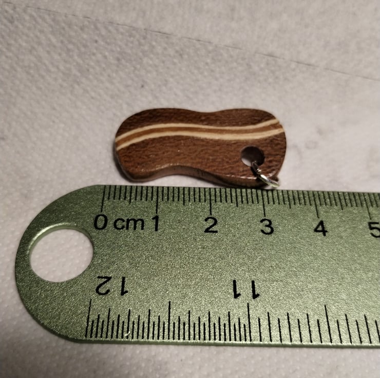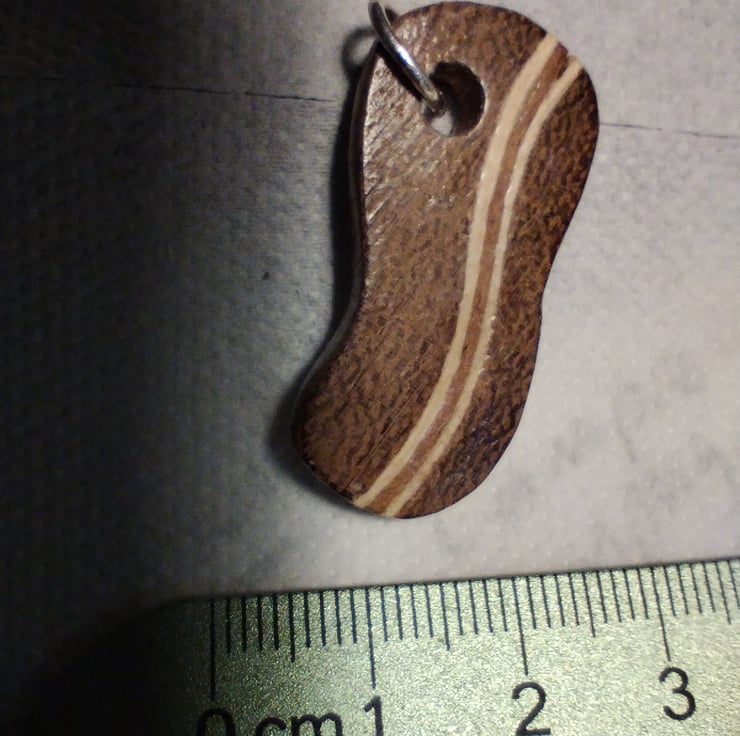 a lovely technique, cut a piece of wood, glue some thin strips in the middle, then cut them again....a sand smooth, a coat of acrylic sanding sealer (chestnut toy safe) then a polish with carnauba wax....add a little silver rine and the pendant is ready to find a new owner