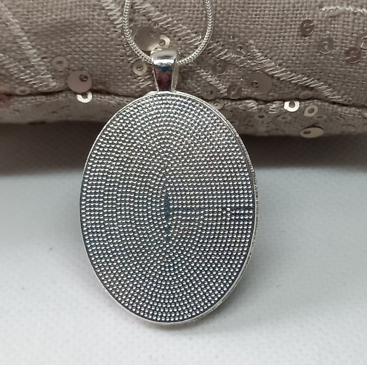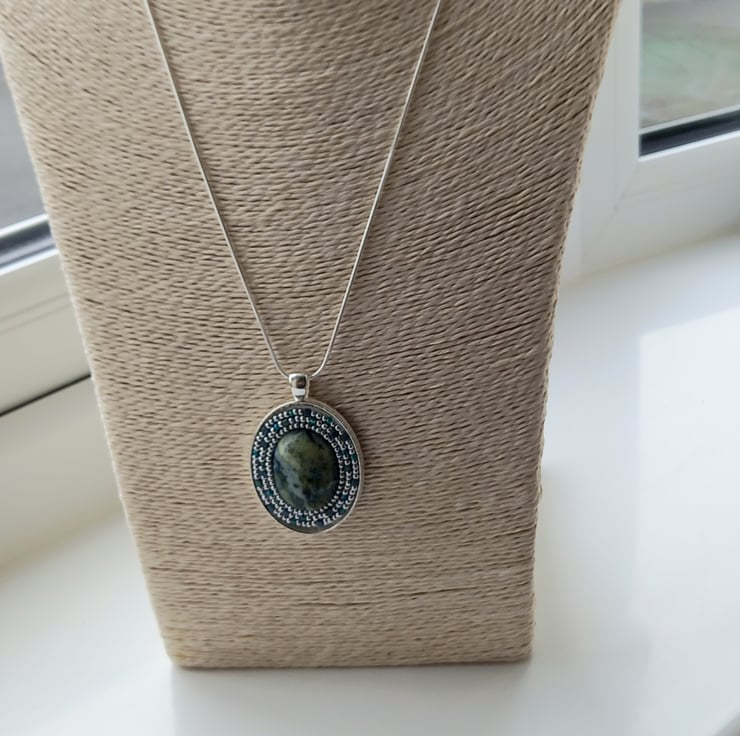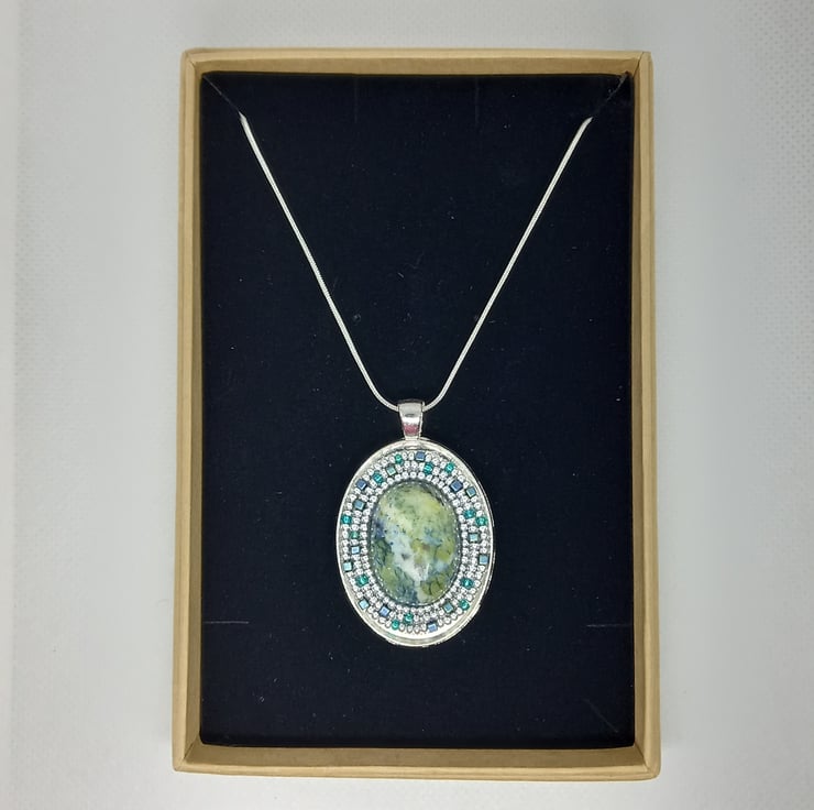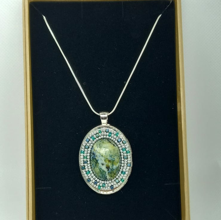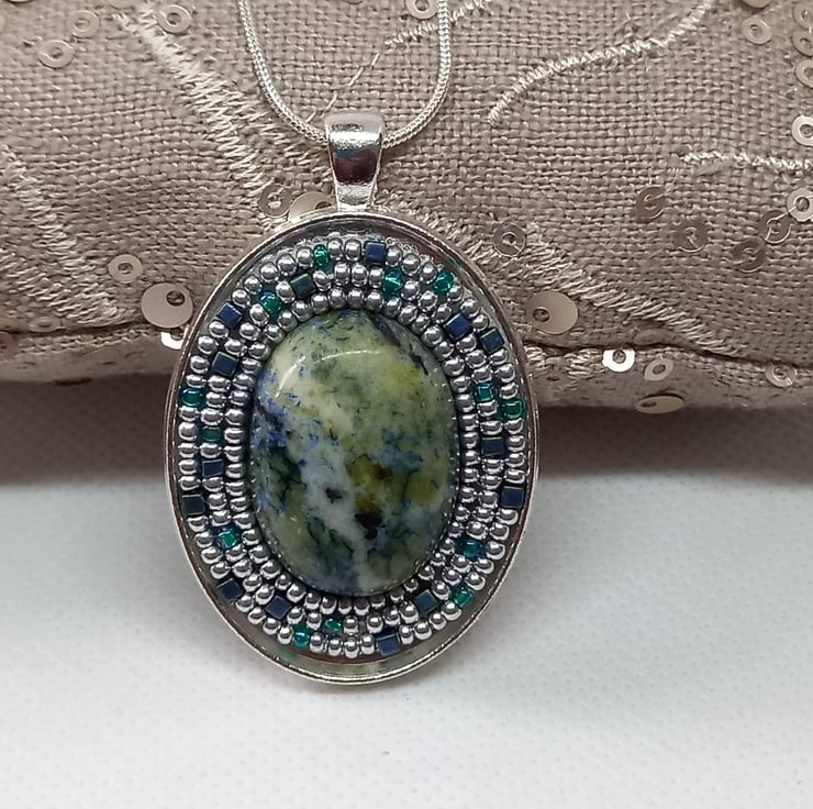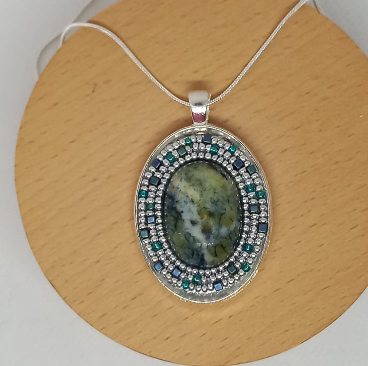A beautiful kiwi jasper oval cabochon in multiple shades of green is the star of this pendant. It is surrounded by galvanised silver seed beads, miyuki cube beads and emerald seed beads which are all bead embroidered onto a bead backing. The whole piece is set within a bezel tray for extra durability and suspended from a 20" silver plated snake chain with a lobster clasp.