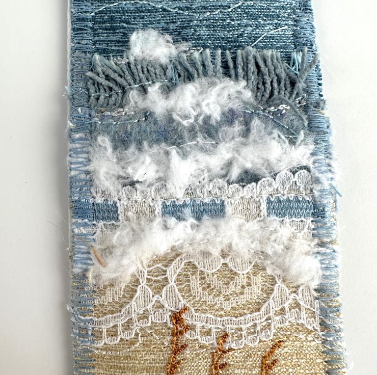 This lovely beach scene bookmark features waves breaking onto a sandy beach under a partly cloudy sky. The bookmark is made from a variety of fabrics and pieces of haberdashery. I’ve then added free-motion embroidered detailing. The colour scheme includes shades of blue, cream, white, golden brown and blue-green. The sky is made from pale blue and cream variegated print fabric. The sea consists of blue fabrics, fabric selvedge, and white fluffy yarn and lace. The sand is made from golden cream fabric. The sea and sand features free-motion embroidered detailing. I’ve used free motion embroidery to add some reeds, using golden beige and blue-green thread. I’ve also added a piece of cream twill ribbon, with the words “Beach life”, which I’ve hand-stamped in black ink (this has then been ironed to make it water-resistant). The bookmark has been stiffened with an inner layer of interfacing, backed with pale blue upholstery fabric, and edged with zig-zag stitching in blue thread.