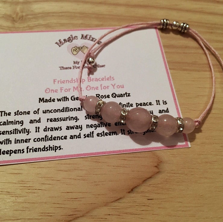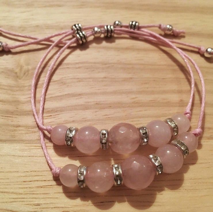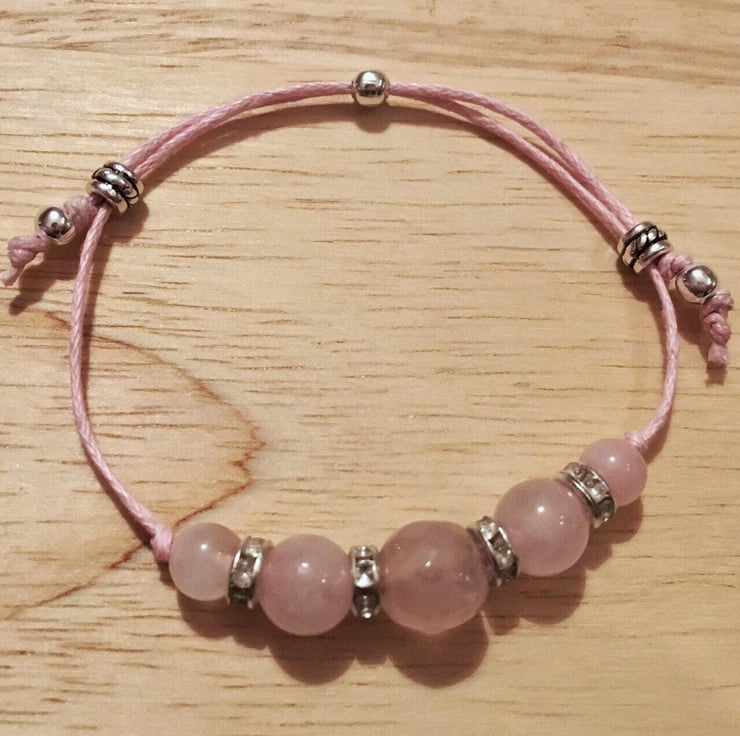 This design has been made using 5 beautiful Rose Quartz Gemstones, the stone of the heart. It has been designed with 6mm and 8mm beads flanking the central focus, a 10 mm faceted Rose Quartz, with sparkly spacers in between.