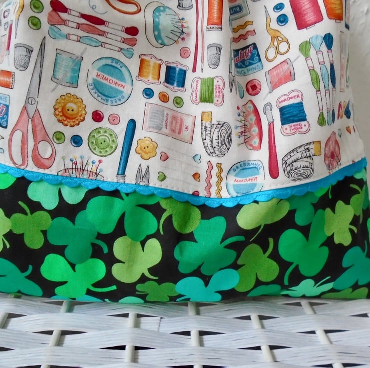 Made in a couple of lovely cotton fabrics , & embellished with a scalloped trim on the front .