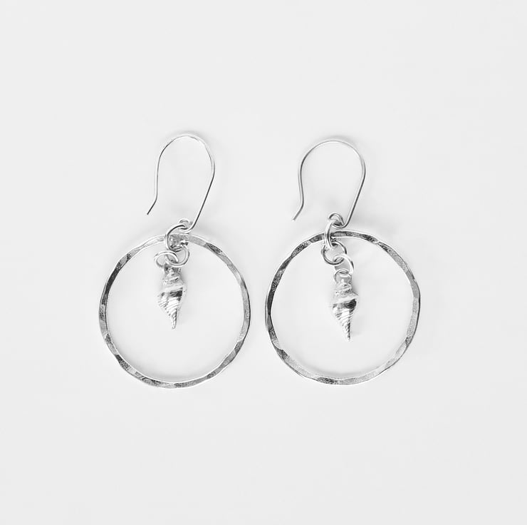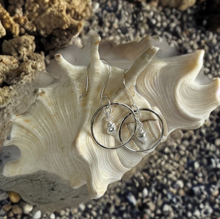 Discovering elegance with these artisan-crafted sterling silver hoop earrings with a hammered finish, adding a touch of texture. Featuring handcrafted fine silver sea shell charms, these earrings exude natural beauty and grace.