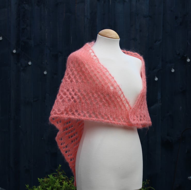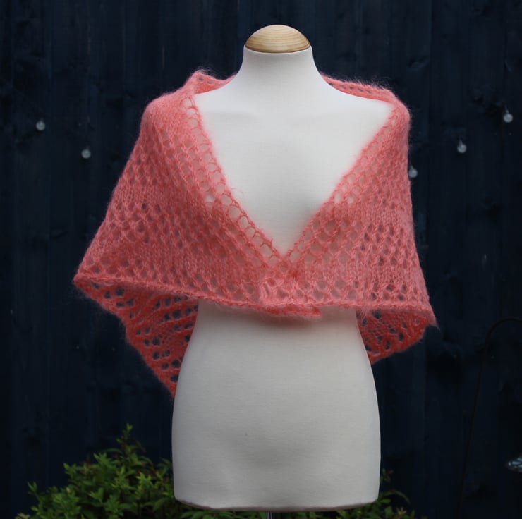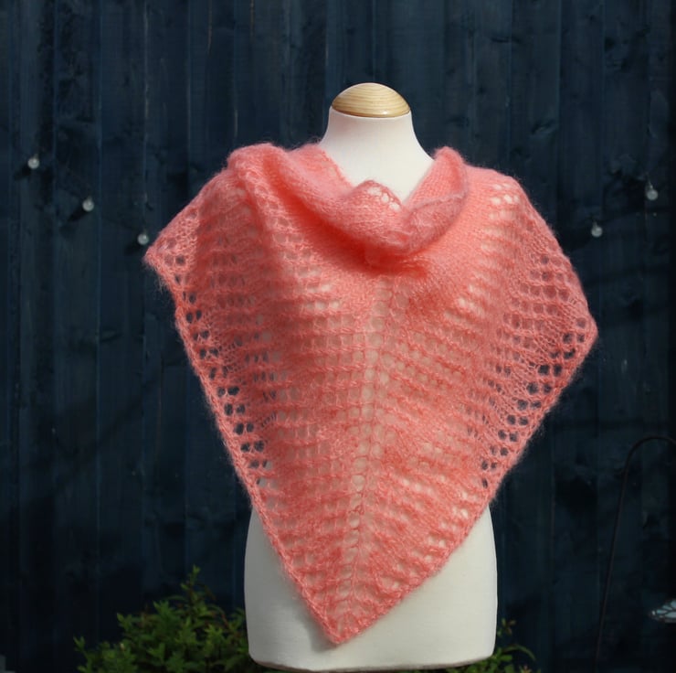 Triangular hand knit shawl in vintage Salmon coloured Mohair yarn - design A2