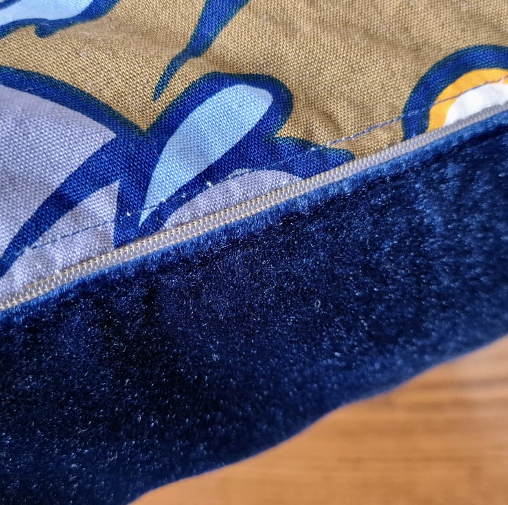 The back fabric is a reclaimed, plain, good quality, dark blue coloured velvet, giving the cushion cover a luxury feel.