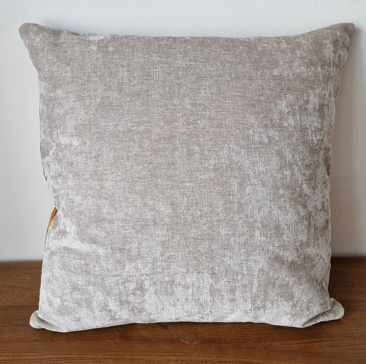The back fabric is a reclaimed, plain, good quality, beige coloured, short pile chenille, giving the cushion cover a luxury feel.