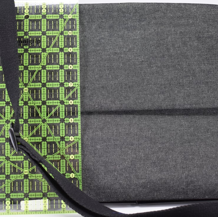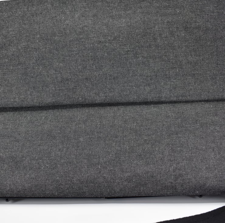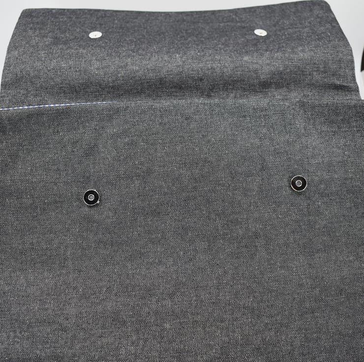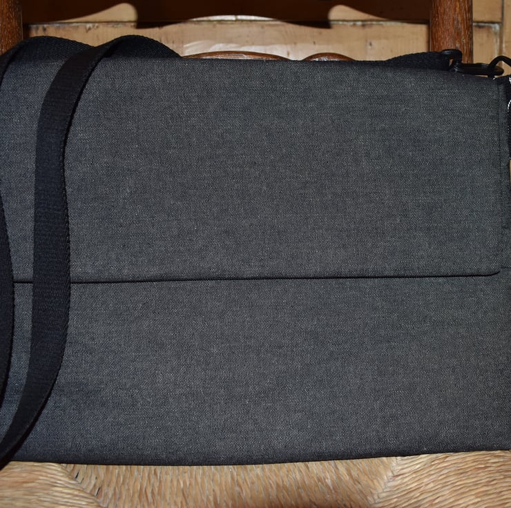 A smart denim case for work and home. It is a perfect gift for all ages useful for school office or home as a storage place. Designed to carry a laptop and papers, or anything else you may need for your day. The bag has a slim shape and is sewn from strong cotton denim in a dark charcoal colour. Inside the bag has a blue and white stripe lining. The black webbing strap is adjustable and can be clipped on or off. On the back is a useful