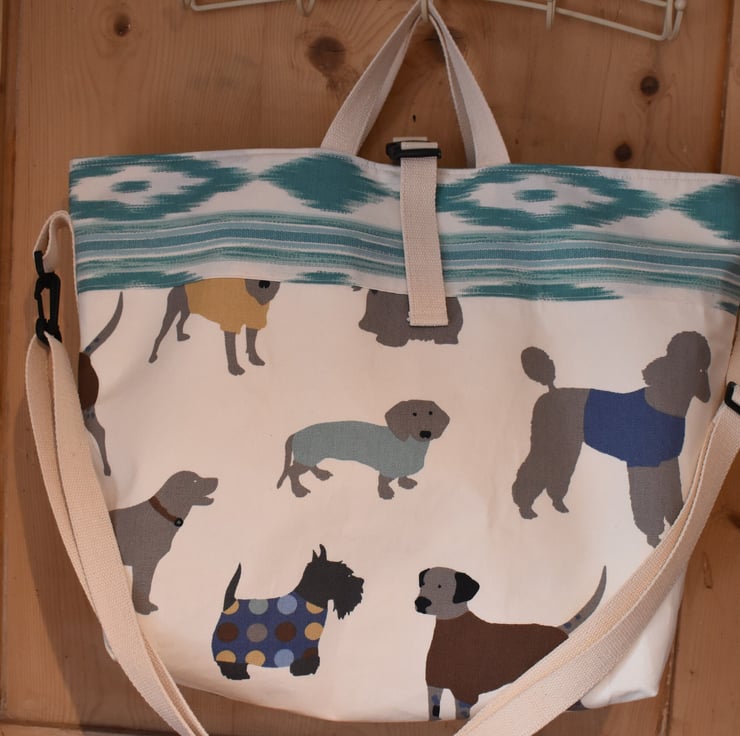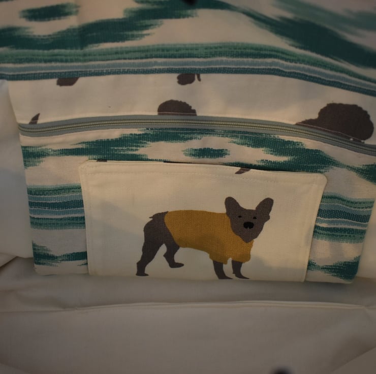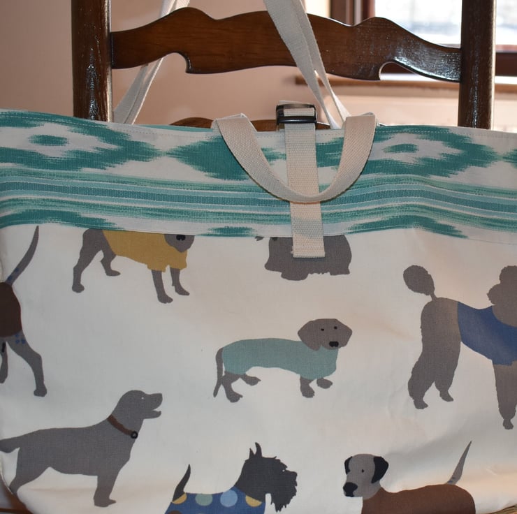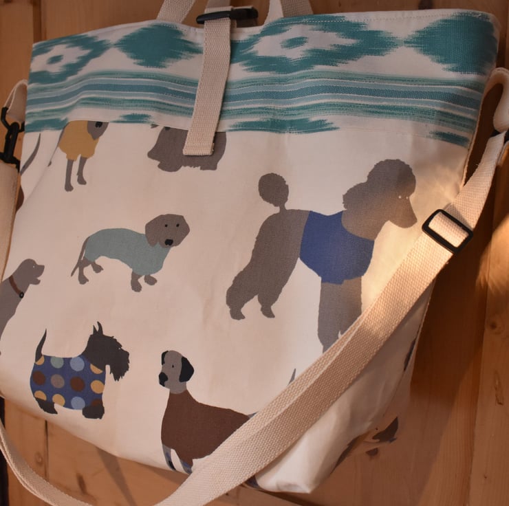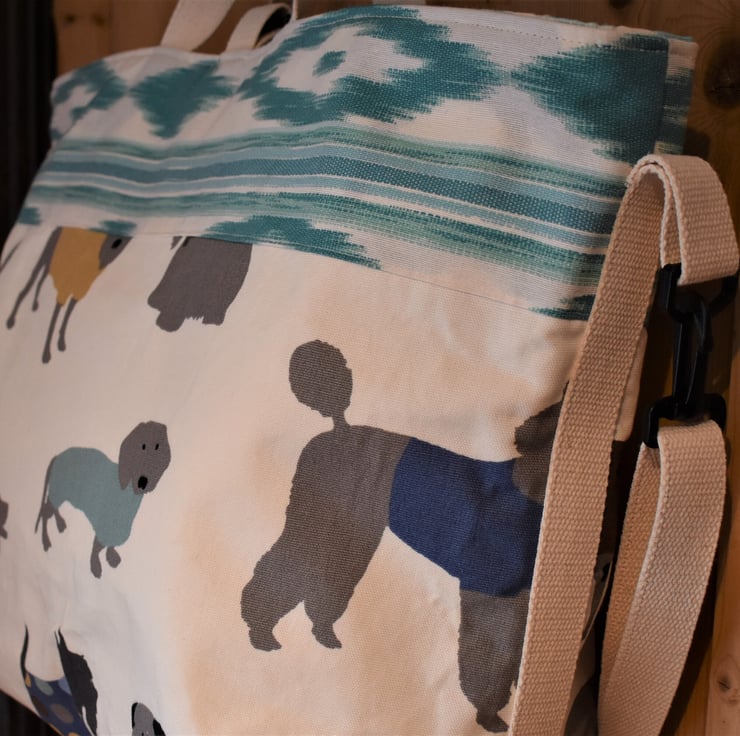 1. A gorgeous large tote or shopping bag hand sewn from especially matched dog print and a turquoise Ikat print from Spain.