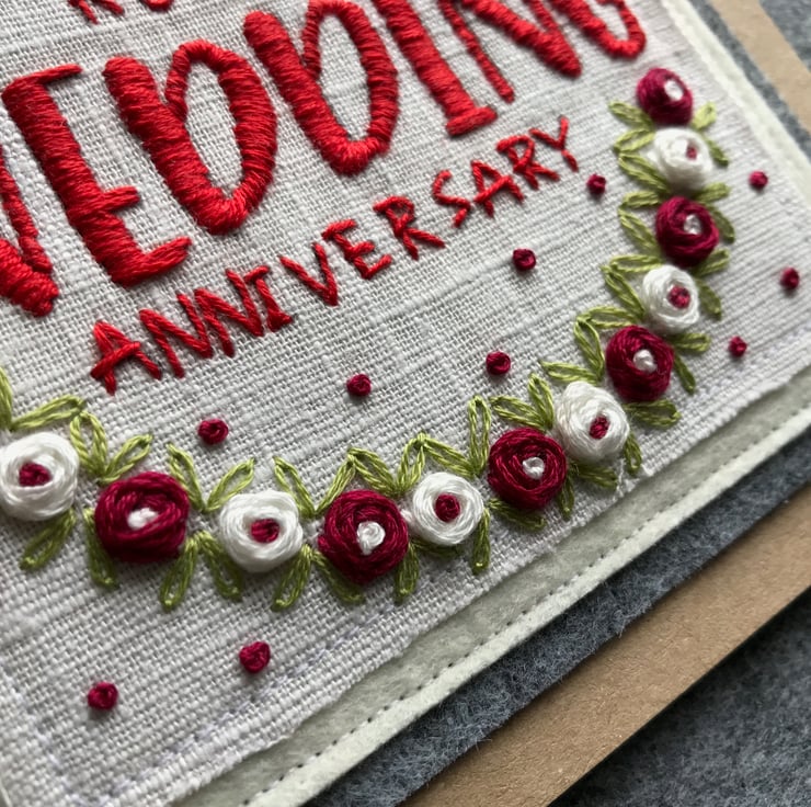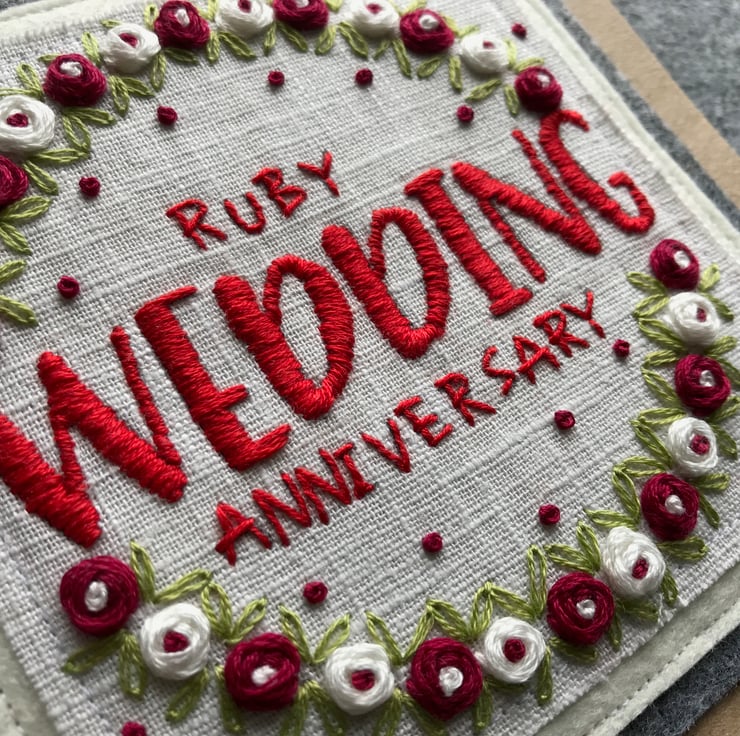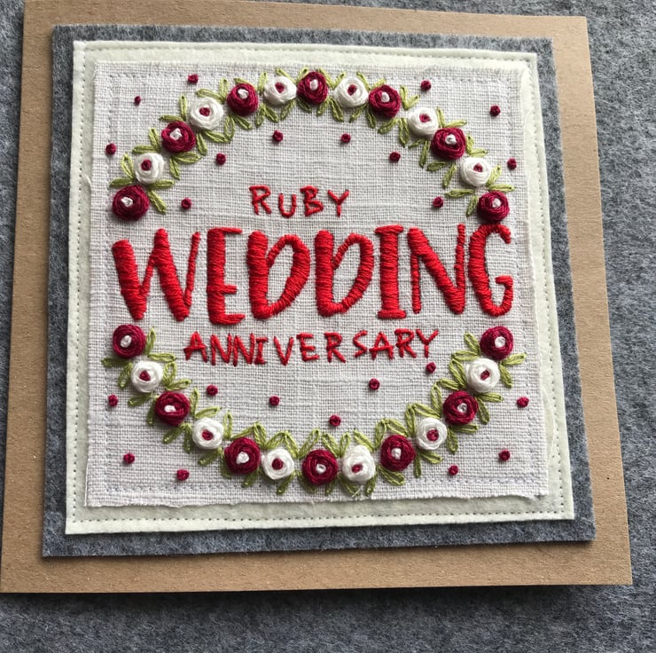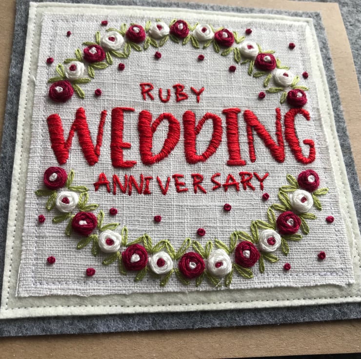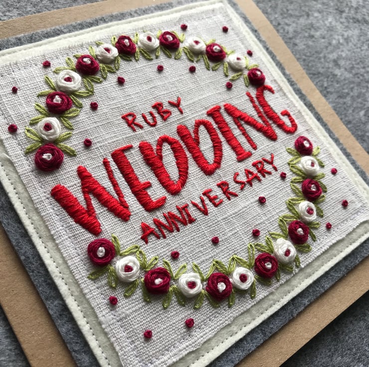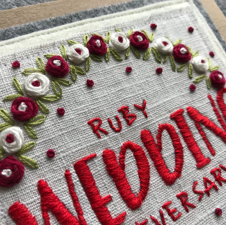 The card showcases the delicately hand-embroidered phrase 'Ruby wedding anniversary' at the center, encircled by a ring of hand-stitched flowers and leaves. The design is elegantly completed with tiny French knots.
