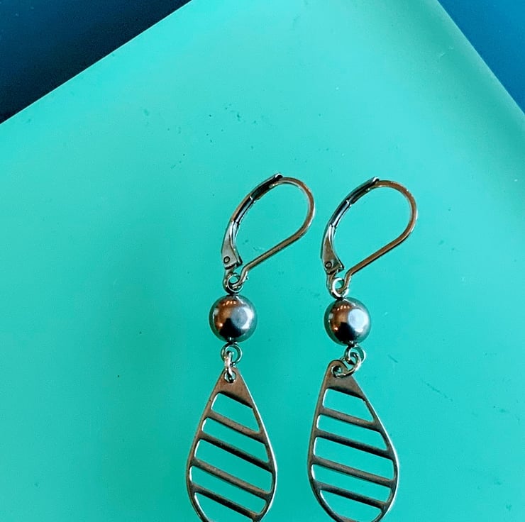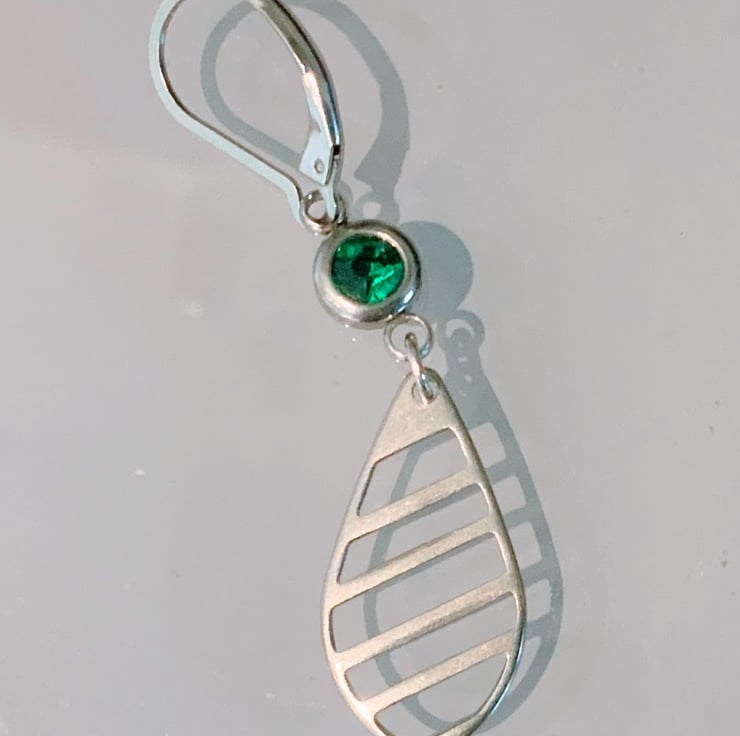 A modern stripe design stainless steel teardrop pendant charm,featuring emerald green rhinestones within a stainless steel casing which reflect beautifully in different light settings.