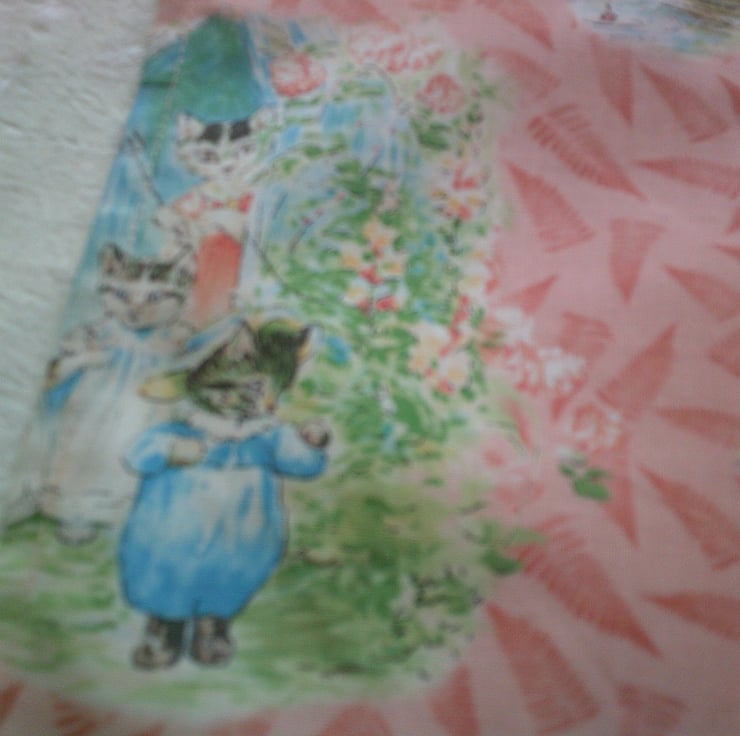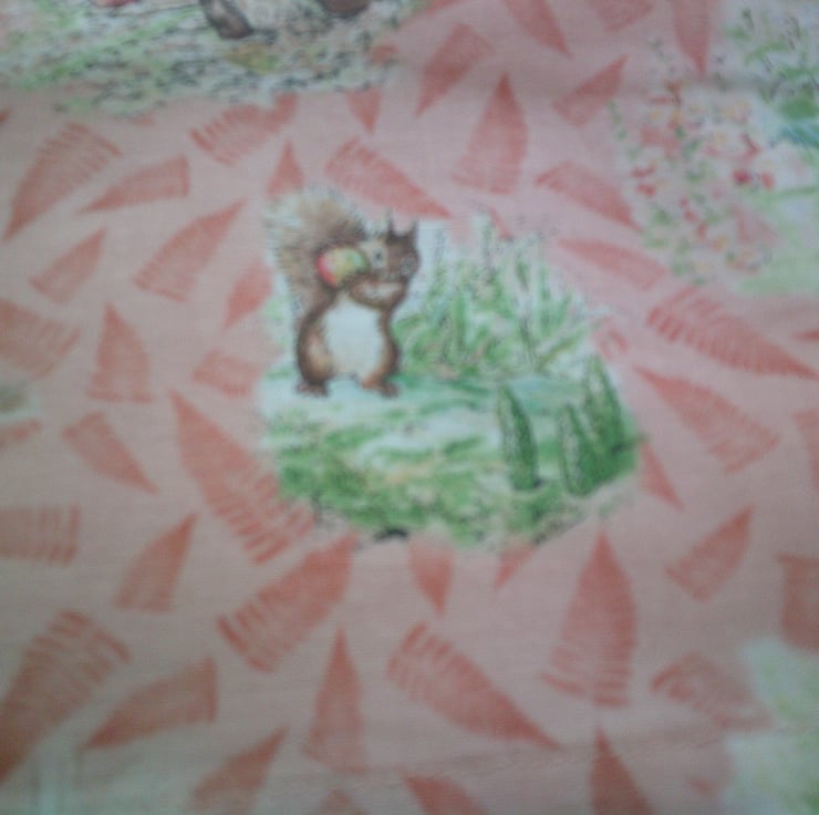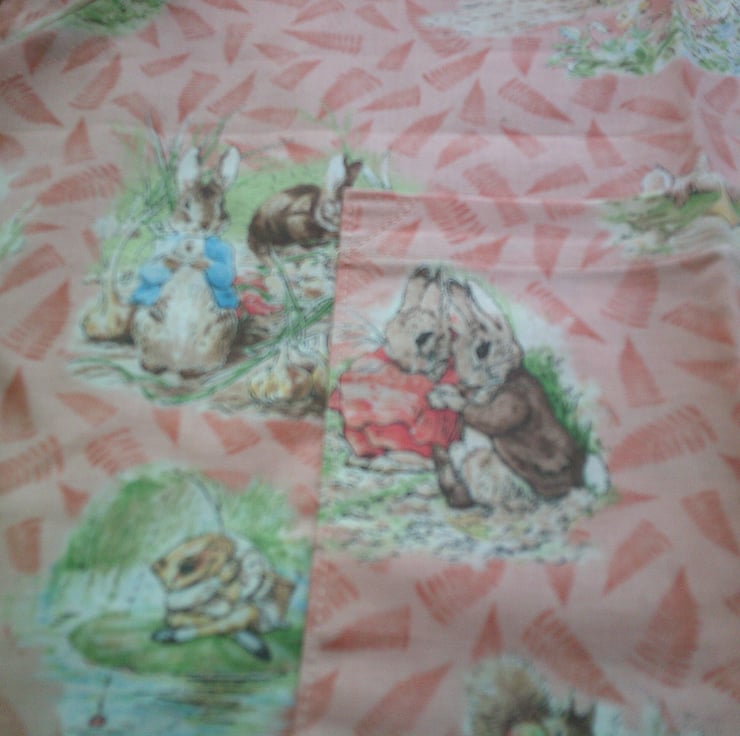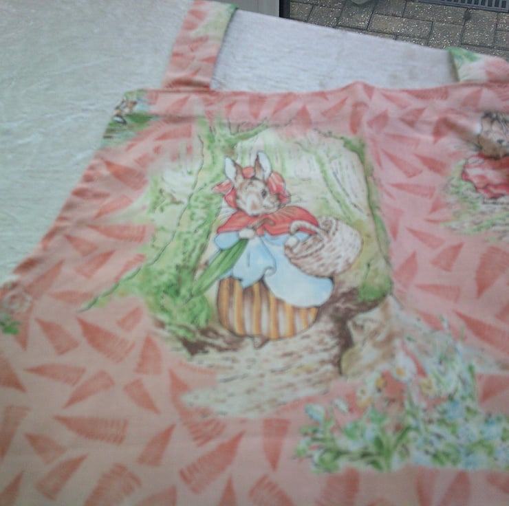 The design on fabric used for this apron is of scenes from The Tales of Beatrix Potter including Jemima Puddle duck, Piggling Bland, Jeremy Fisher, Squirrel Nutkin and Peter Rabbit on a peachy colour background.