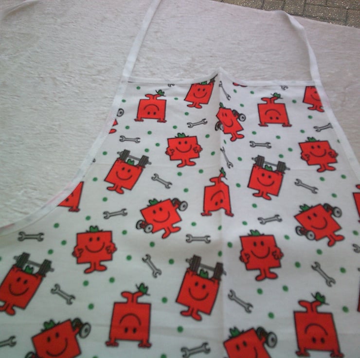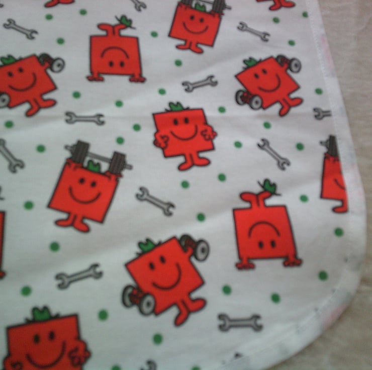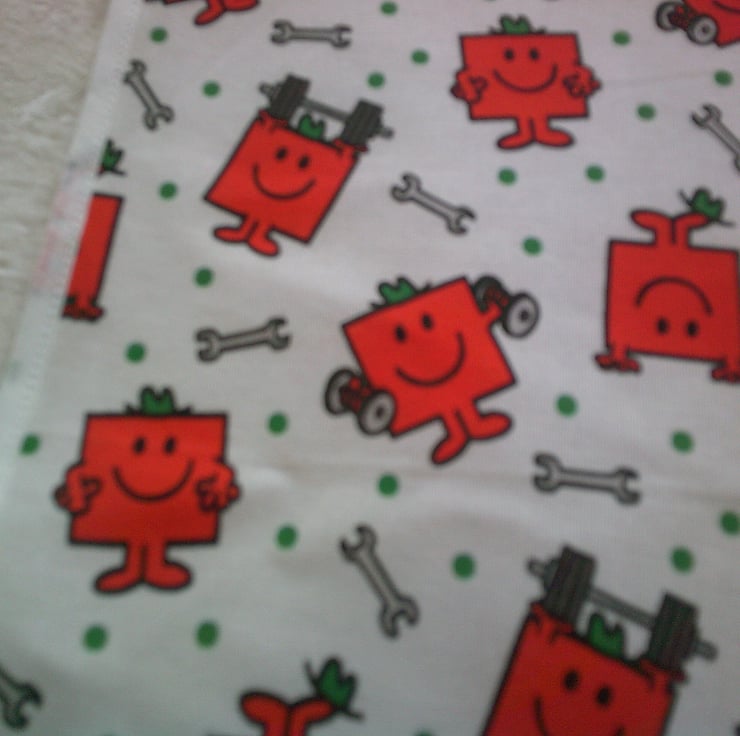 The fabric used has a design of Mr Strong on white background and is edged with white bias binding.
