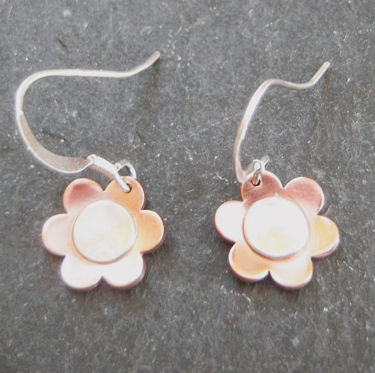 Copper flowers with sterling silver middles and ear wires. 13mm across .Slight concave dome.
