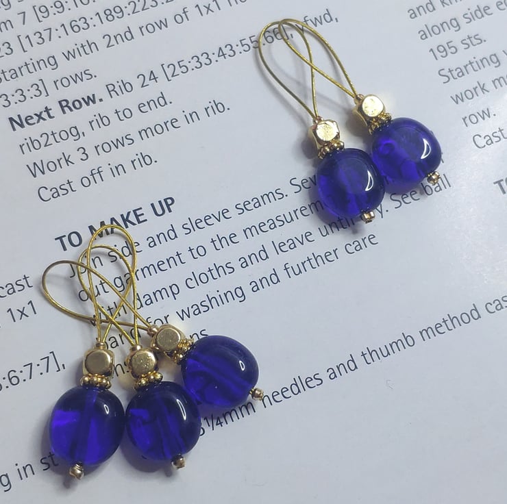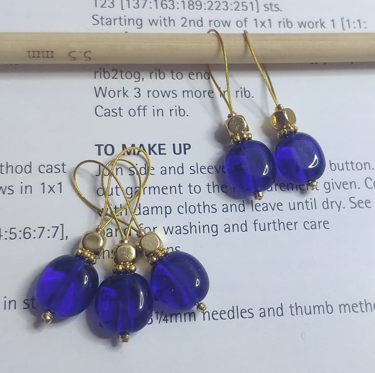 A set of 5 stitch markers for knitting. Made with glass beads, gold plated spacer beads and plastic coated wire. Designed to glide effortlessly over knitting needles without snagging.