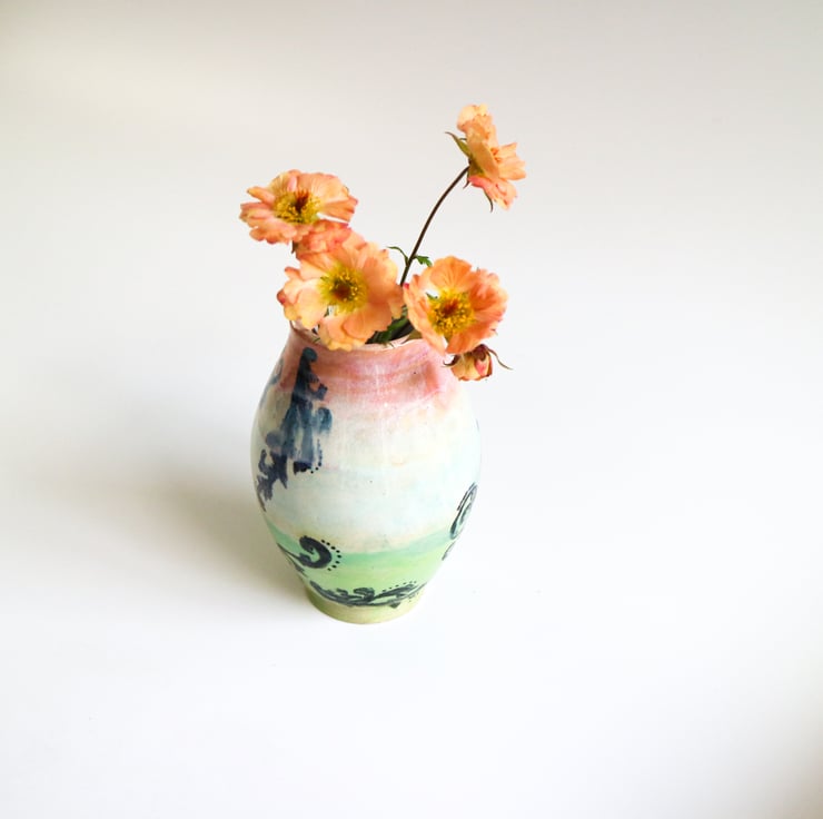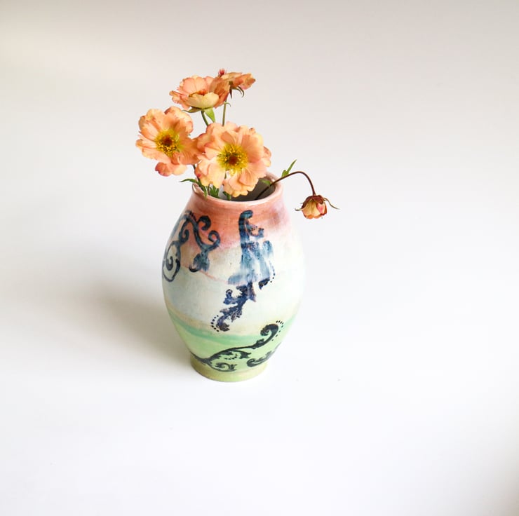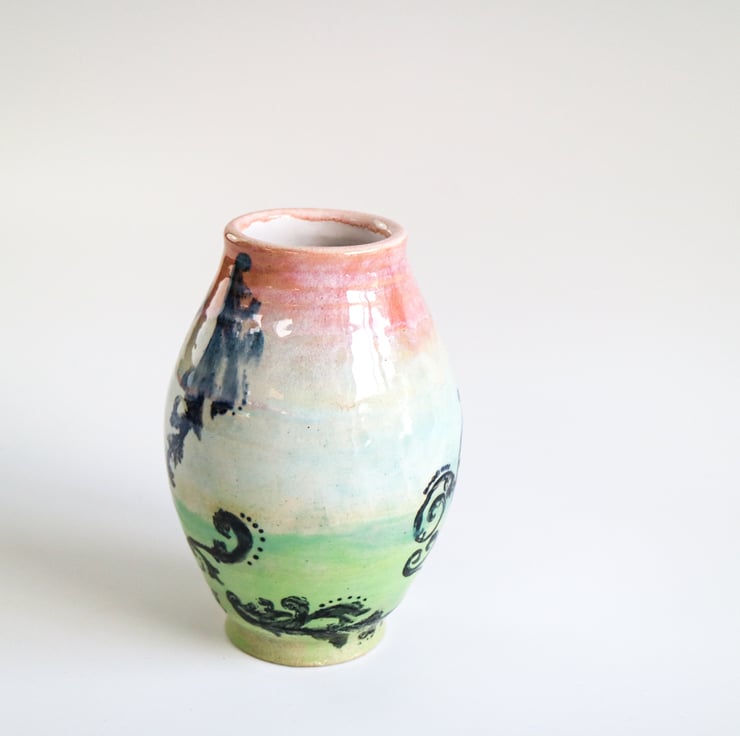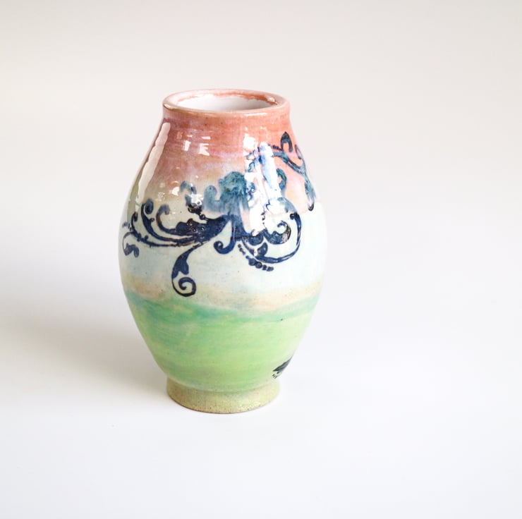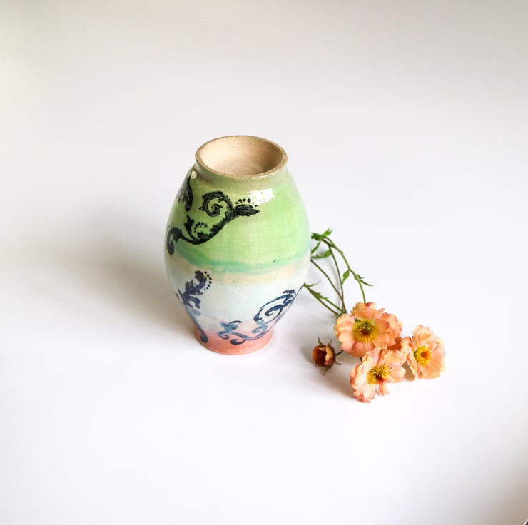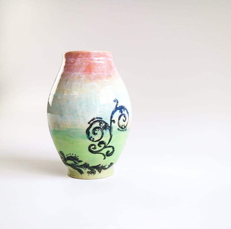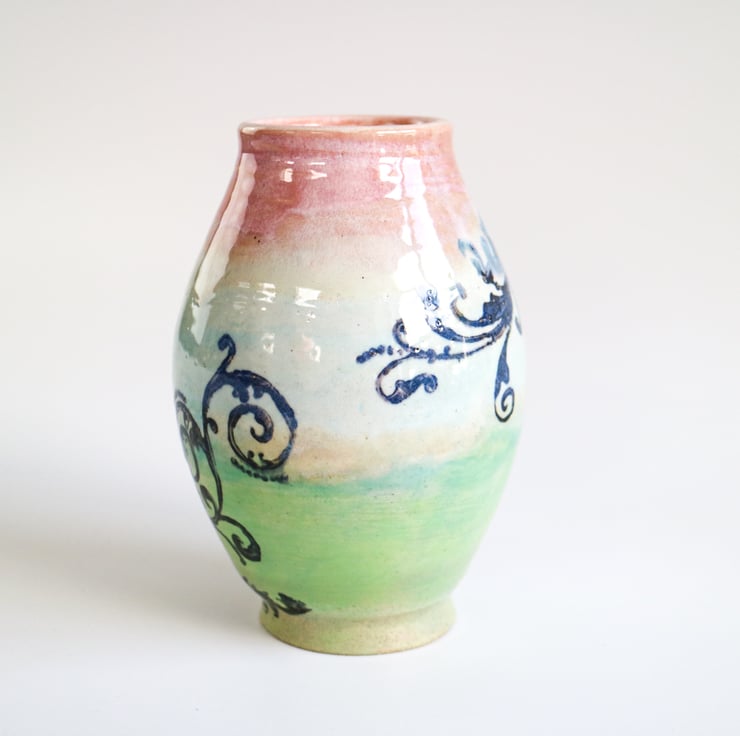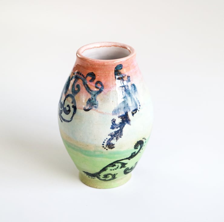 The vase has been decorated with a flourish design and layers of green, blue, and pink glaze, creating a vibrant, one-of-a-kind piece.