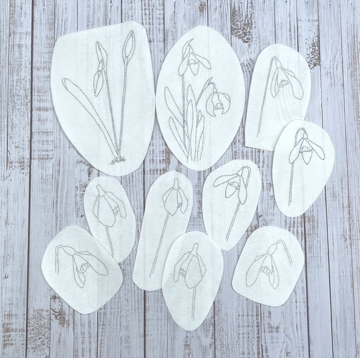 10 stick and stitch snowdrop transfer designs created from my own sketches.