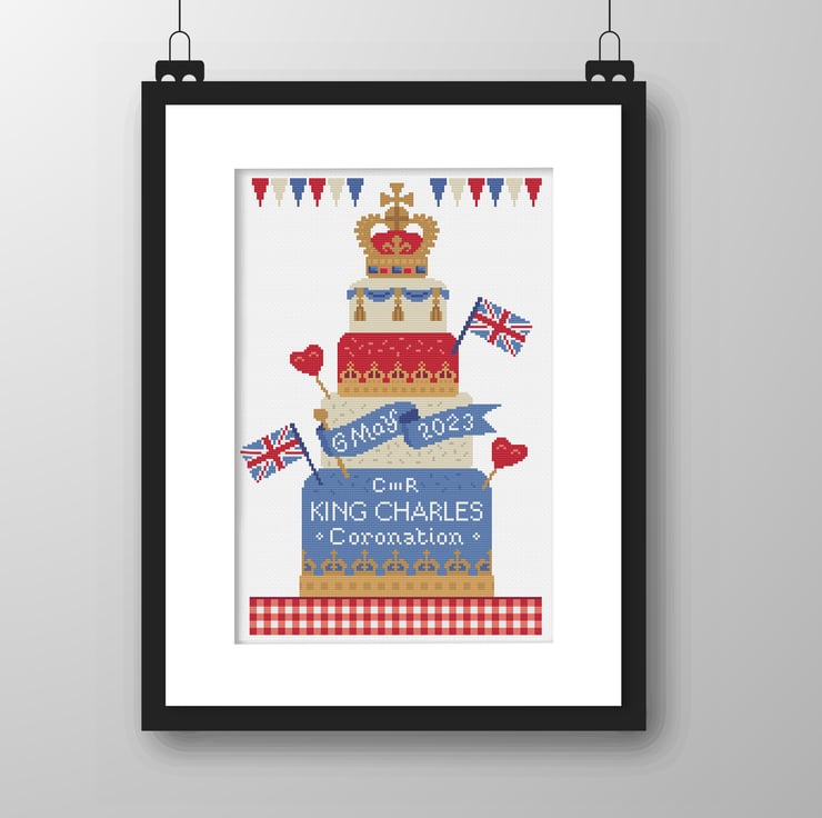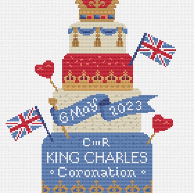 Cross Stitch pattern to celebrate King Charles III Coronation Day Street Party Cake with crown and flags by Vivsters counted chart 110B