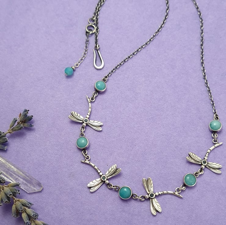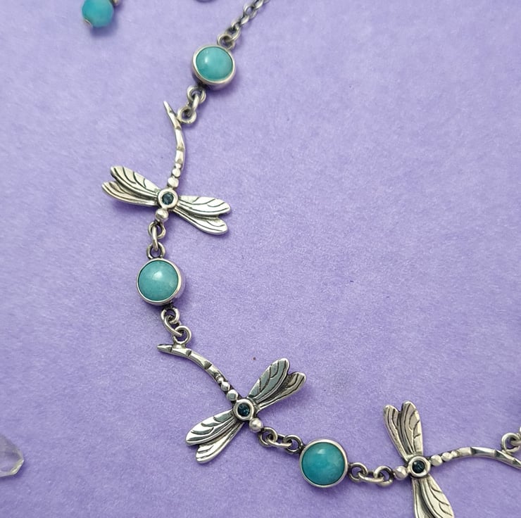 This is a lovely dragonfly necklace with beautiful blue-green amazonite cabochons. The dragonflies have a London blue topaz set in the center. They really compliment the amazonite and give a lovely little sparkle. They are 15mm wide at the wing span and 15mm length. I have used a delicate but strong sterling silver chain that is finished with a handmade sterling silver catch and a pretty micro faceted amazonite bead drop.