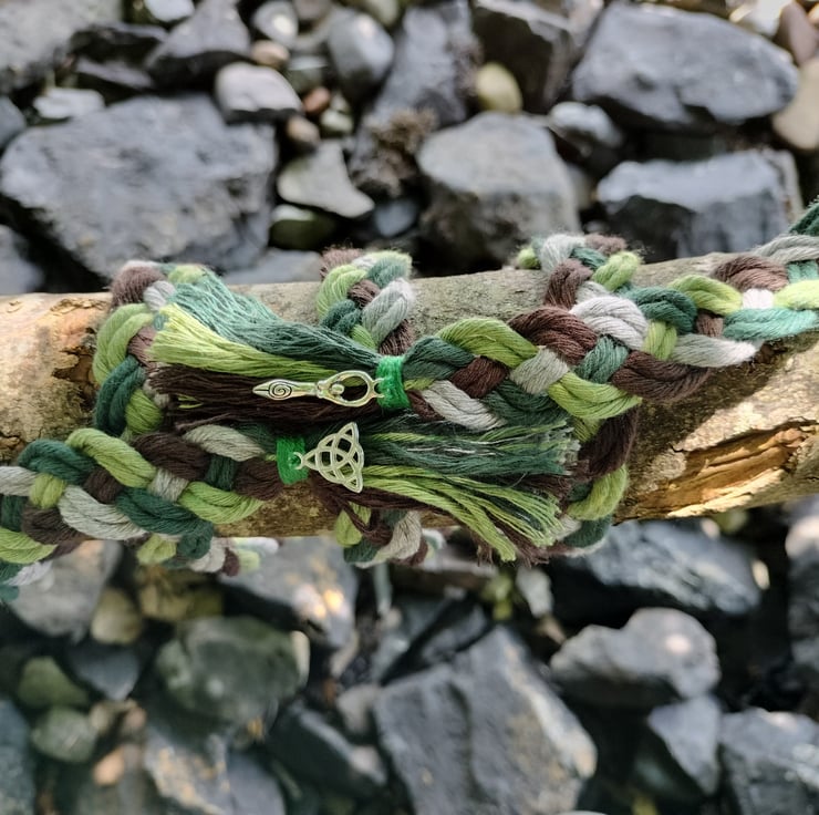 The eight strand cord in the photos is made with four complementing colours (samphire, scots pine, peat & lichen) & two charms (celtic goddess & celtic triquetra). The cord is FULLY CUSTOMISABLE so you may choose your own colours & charms for the meanings they hold to you.
