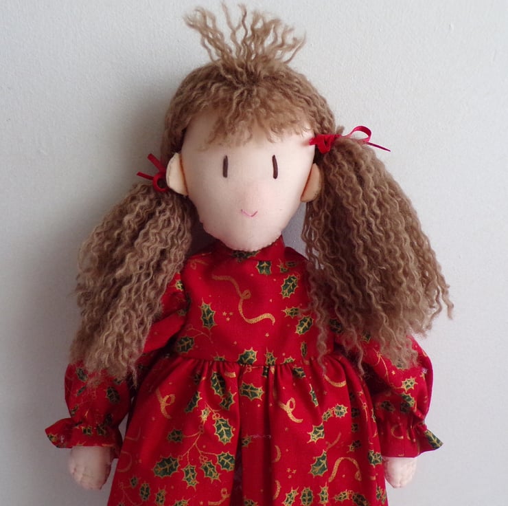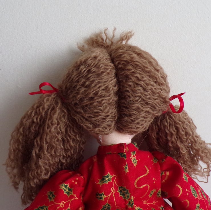Belle is a beautiful rag doll, she stands at 14 inches tall, perfect size for little arms to cuddle. She comes to you in a removable Christmas dress, with fixed bloomers on under the dress, little black shoes and red ribbons in her hair. Belle is filled with polyester filling. A handstitched doll, made with love. Belle would make a lovely forever friend for the little (or big) person in your life.