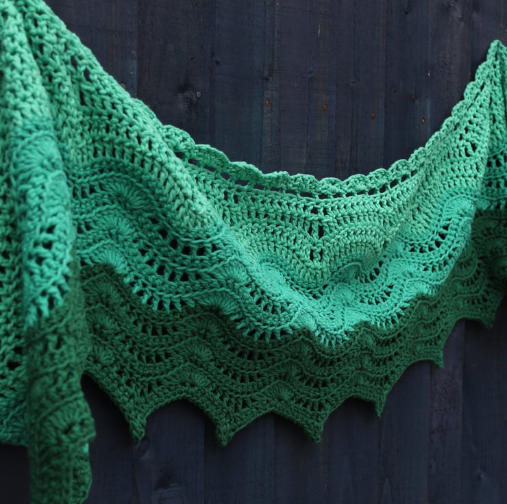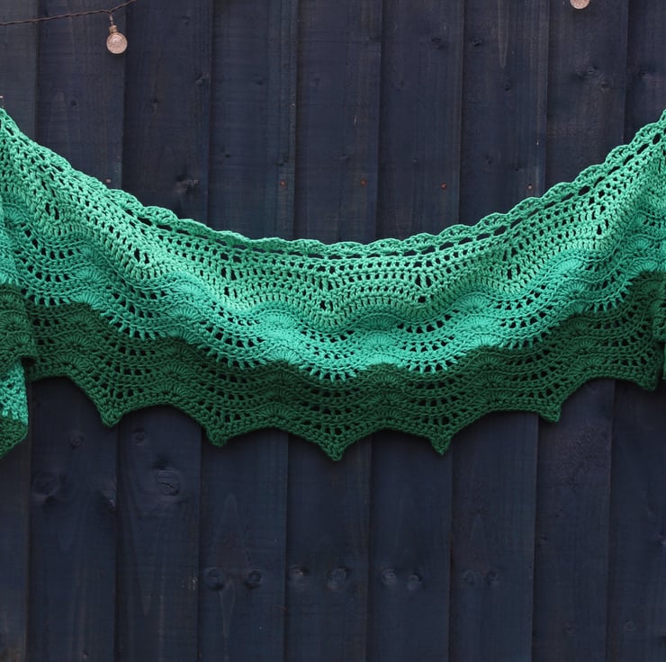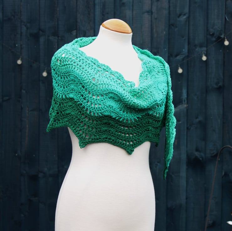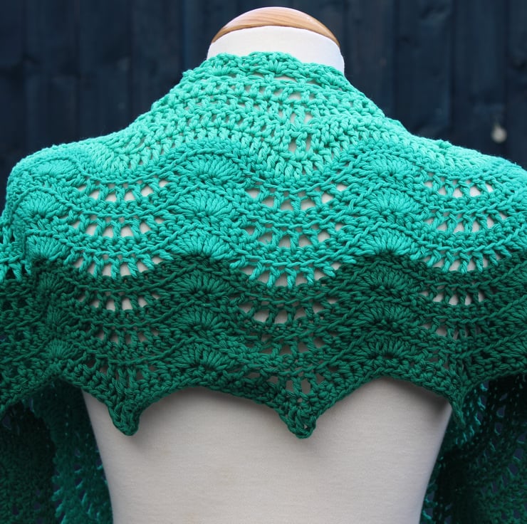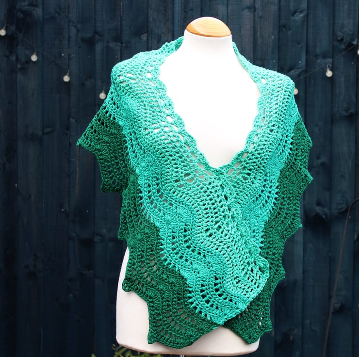 This unique, slightly crescent-shaped hand crochet wrap, created in three shades of blue-green cotton, is an ideal accessory for any occasion. The shaping of this wrap effortlessly embraces you. Whether you're dressing up in formal wear or adding a touch of flair to a casual look with jeans, or even enhancing the warmth of your winter coat, this wrap will capture attention.