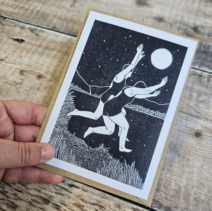 Single greetings card digitally reproduced from the original linocut print Midnight Splash . Blank inside for your own best wishes, this card comes with a recycled brown kraft envelope.