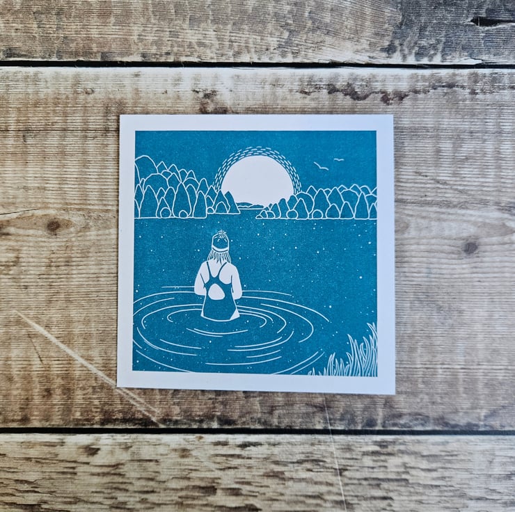 Single greetings card digitally reproduced from the original linocut print Sunrise Swimmer'. Blank inside for your own best wishes, this card comes with a recycled brown kraft envelope.