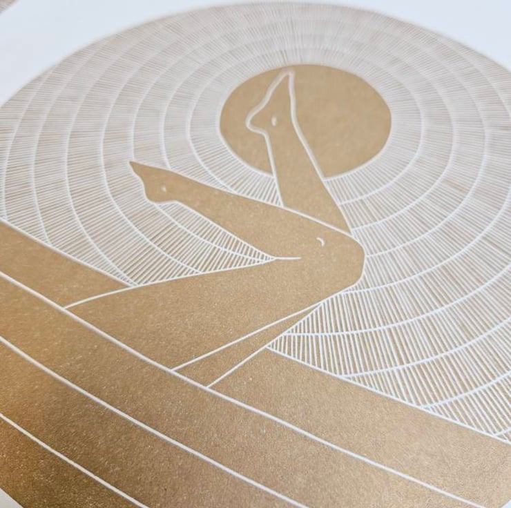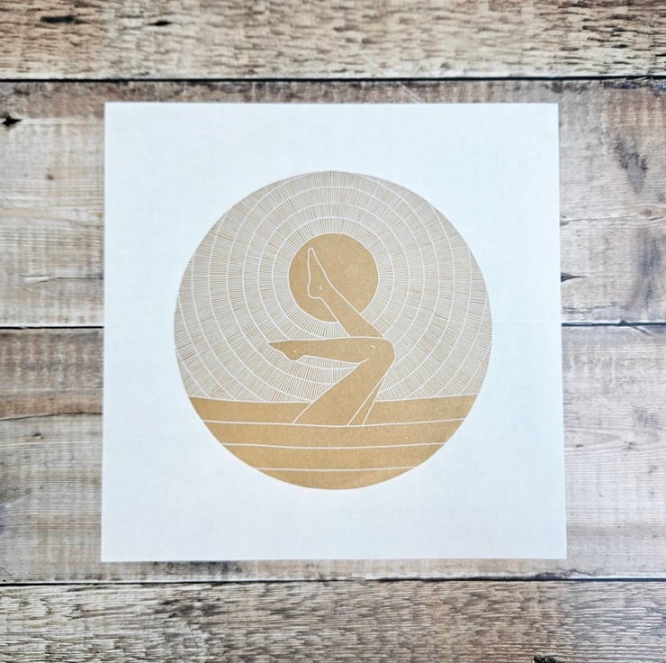 The linocut has been inked in a rich golden yellow and then pressed onto Masa, a traditional Japanese printing paper.