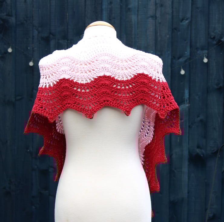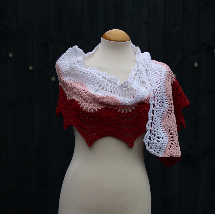 This unique, slightly crescent-shaped hand crochet wrap, created in red, pink and white cotton, is an ideal accessory for any occasion. The shaping of this wrap effortlessly embraces you. Whether you're dressing up in formal wear or adding a touch of flair to a casual look with jeans, or even enhancing the warmth of your winter coat, this wrap will capture attention.