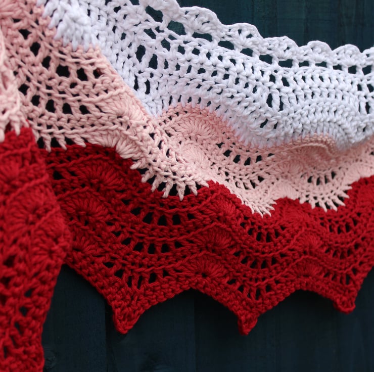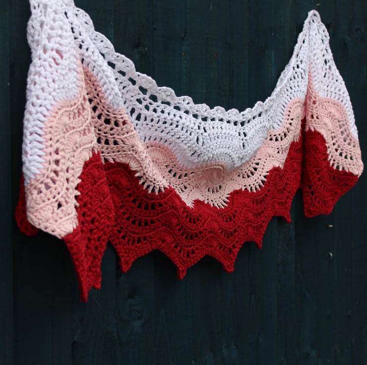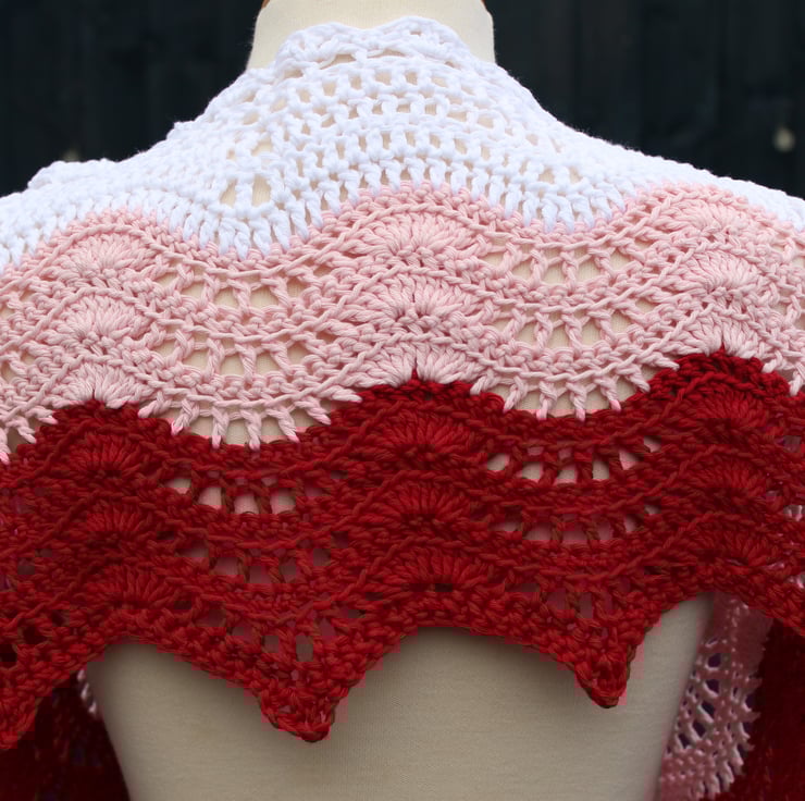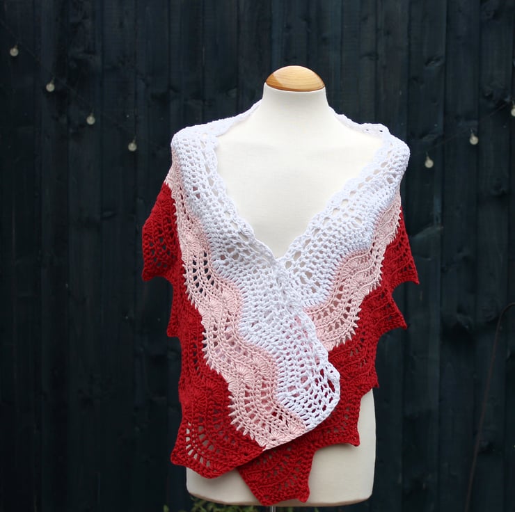 Crochet wrap in three colours of red, pink and white 100% Cotton - design A193