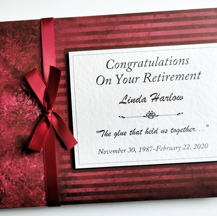 This Retirement Guest Book is decorated with embellishments and a ribbon.