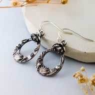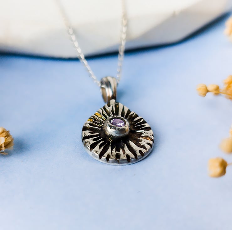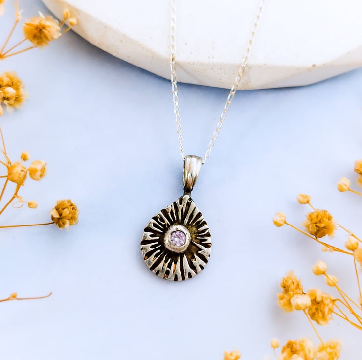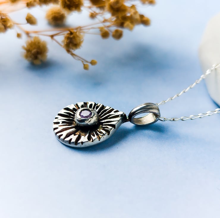 This elegant teardrop pendant has been handcrafted from recycled fine silver, which is 99.99% pure. The design features a delicate allium flower pattern, carefully formed by hand in silver clay, with a soft lilac cubic zirconia set at the centre. Once completed, the piece was fired to transform the clay into solid fine silver, before being finished with a dark patina to highlight the delicate details and polished to a beautiful high shine.