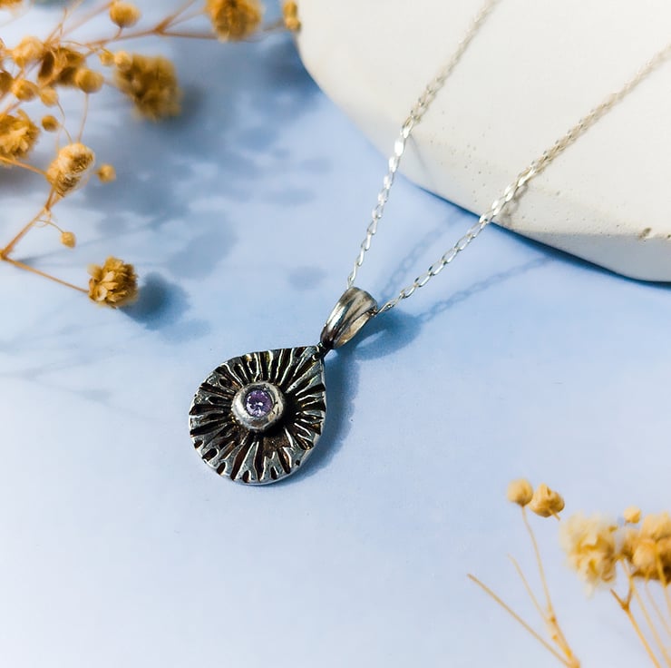 Recycled Silver Teardrop Pendant - Lilac Cubic Zirconia - Allium Flower Pattern