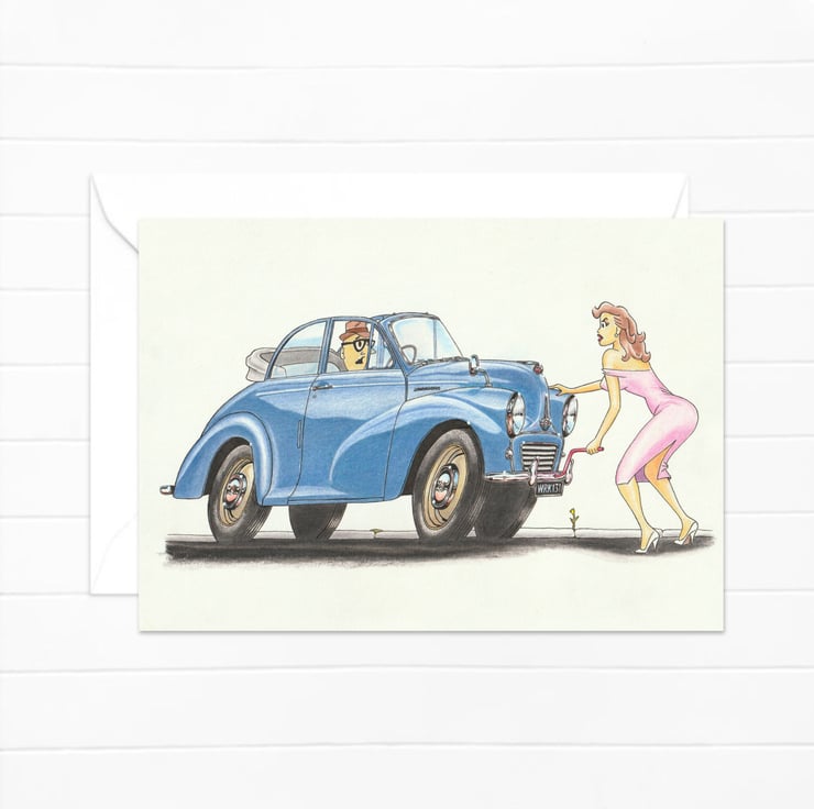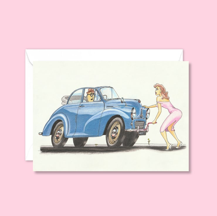 An original art card, printed from a hand drawn pencil illustration in black ink and coloured pencils. Nostalgic artwork featuring a classic Morris Minor.