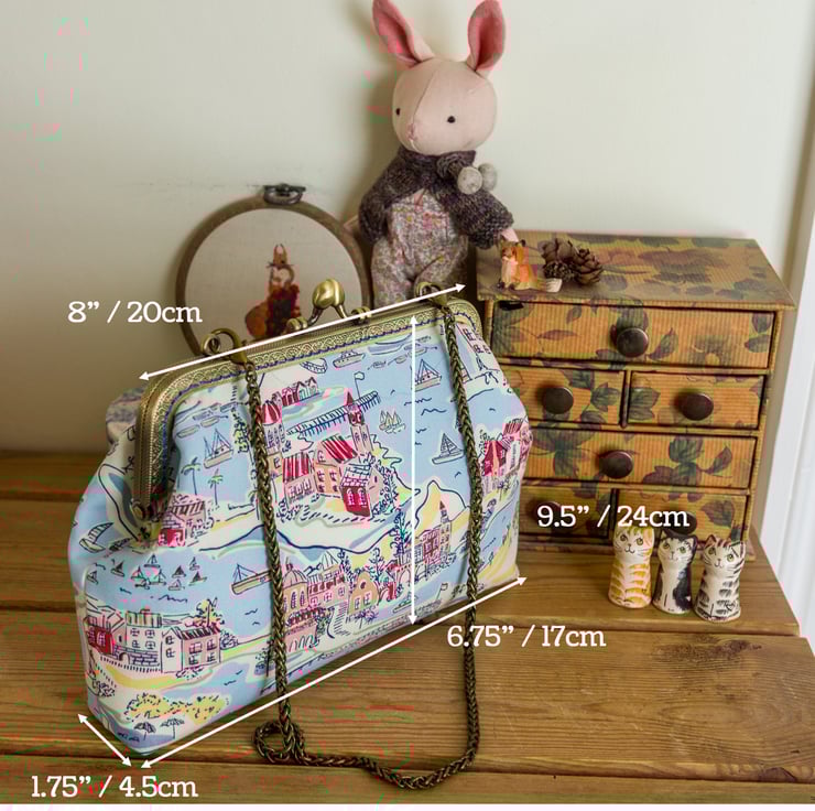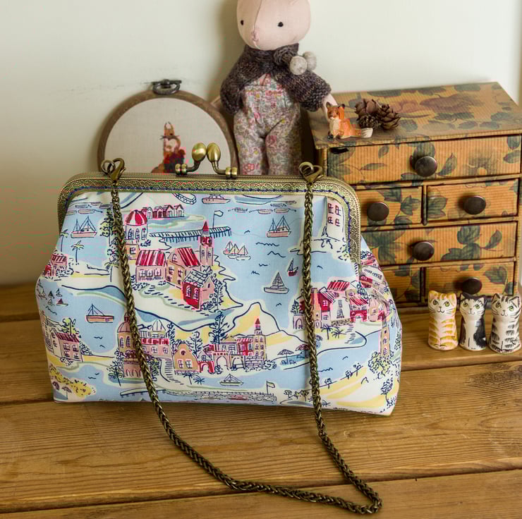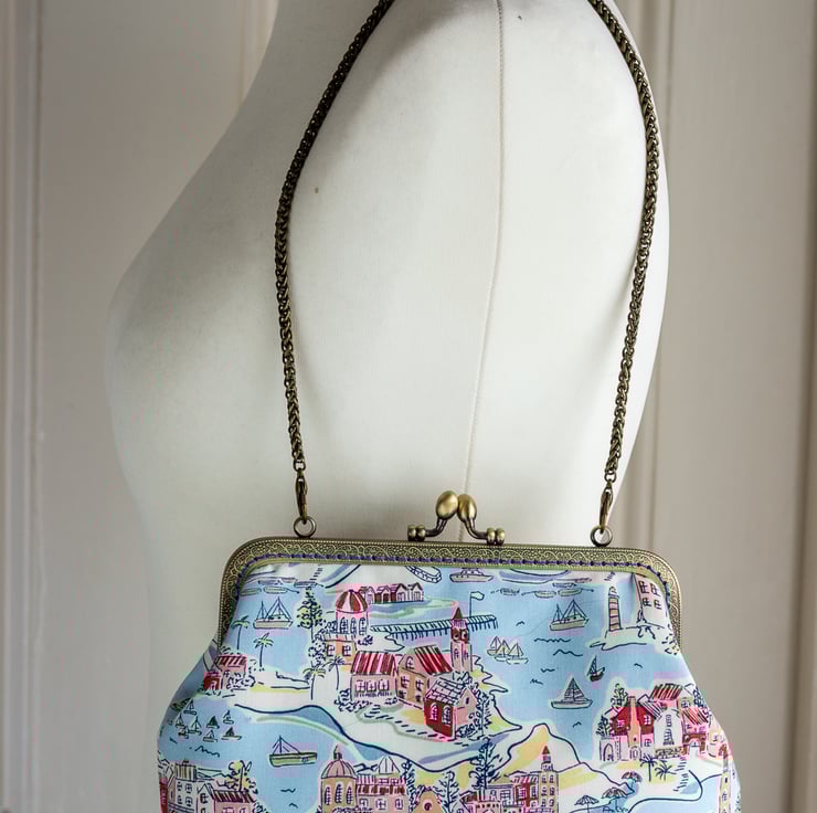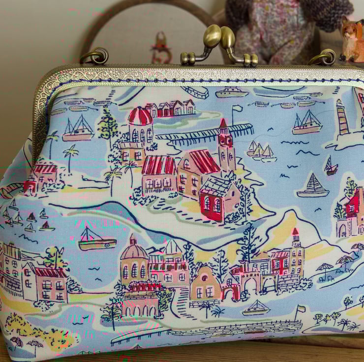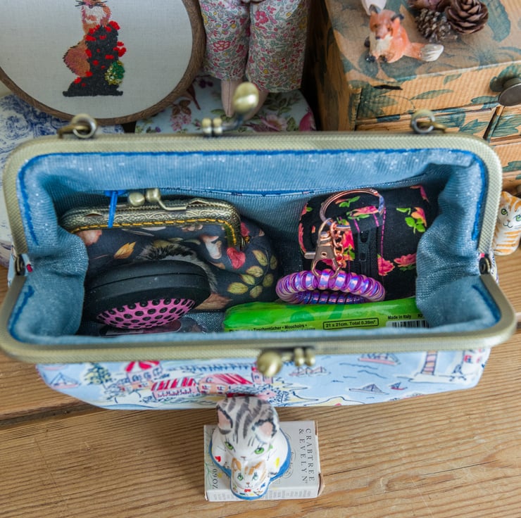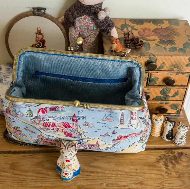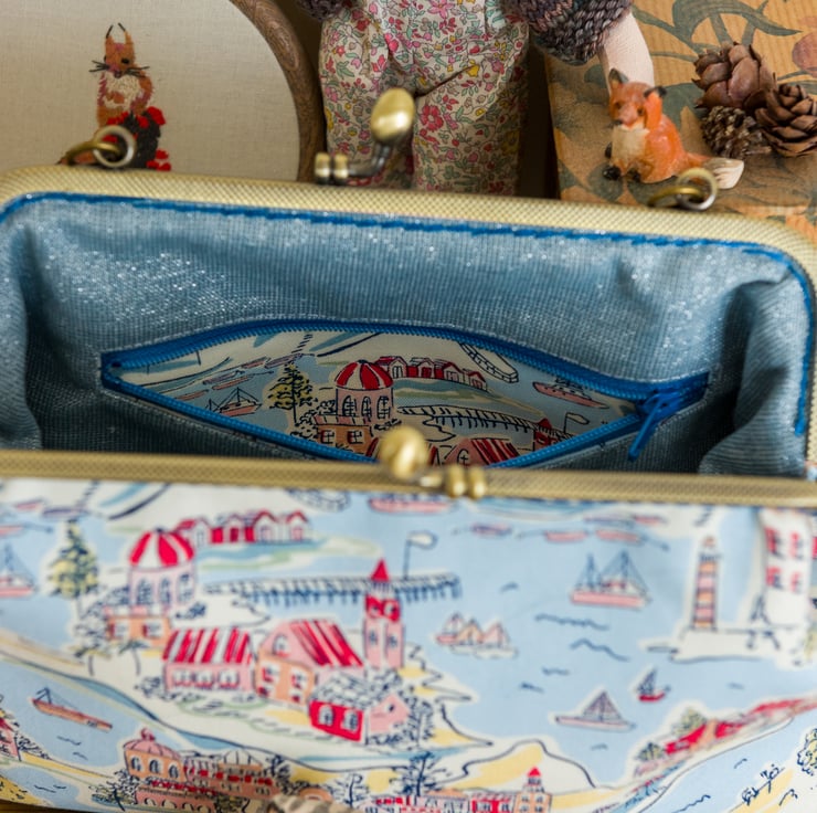 The purse is made with a Liberty cotton (not tana lawn) called 'Adventure Coast' which was "inspired by colourful seascapes and panoramic views of charming coastal architecture. Scenic vistas unfold with pockets of quirky details, from sun loungers, and parasols, to beach huts, boats, and palm trees" - a real Summer holiday dream! It's lined with an Essex Linen in Water blue with silver metallic threads and there's a good sized zip pocket in there too.