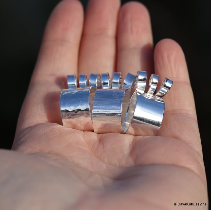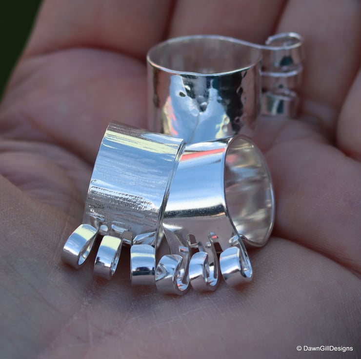 You can choose the more affordable double strand option,where I use recycled sterling silver wire I've flattened in my rolling mill before forming, or the more luxurious option that's made using over 6grams of recycled sterling silver and has 3 loops. I've 3 different finishes for you to choose from - beaten, bark or smooth