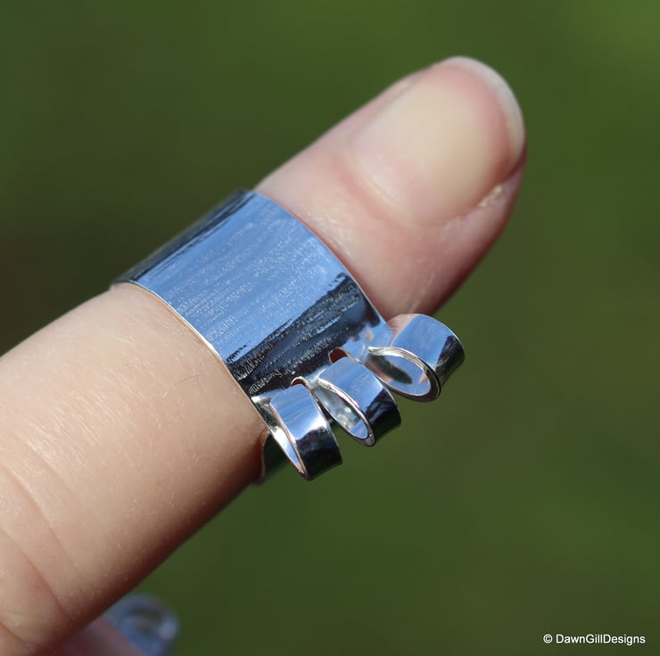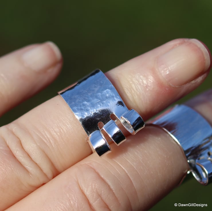 The wire variant is very easy to adjust the size of, the triple is harder for you to adjust because of all that silver. I recommend you tell me the exact size you want your triple ring. The default is a UK L (as shown on my hand in the photos). You might also want to tell me if you are going to wear it on your left or right hand, and have me taper it slightly so that it's narrower at the tip - that's what I've done for mine. (see note blow for sizing tips)