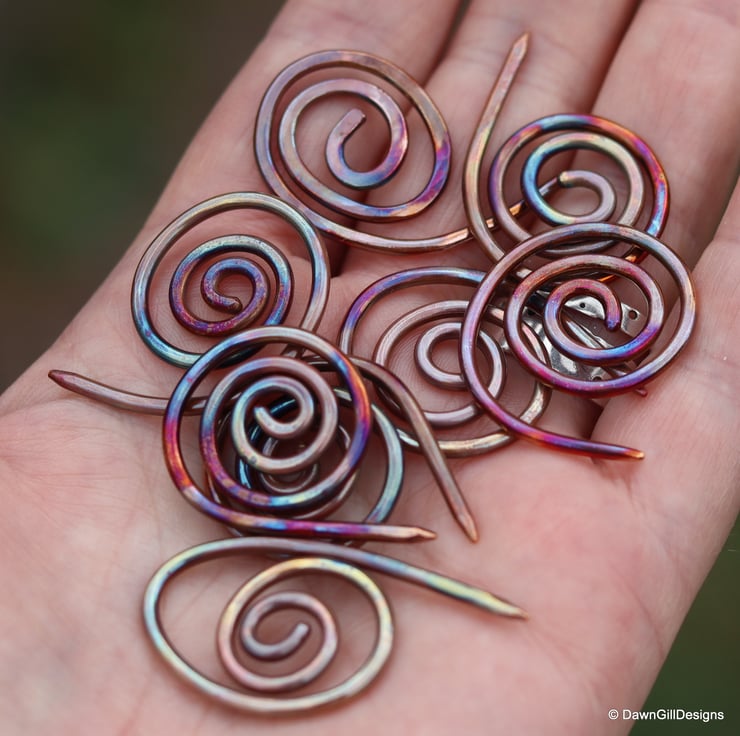 I've used 2mm round, pure copper wire, or 2mm round sterling silver wire. The colours are created by playing SmeltyMelty's flame over the finished and polished pieces, then I hammer them again to complete the firming up. The coil measures approximately 2.5-3cm in diameter, but each will be unique, as you can see from the pile I've got in my hand here.