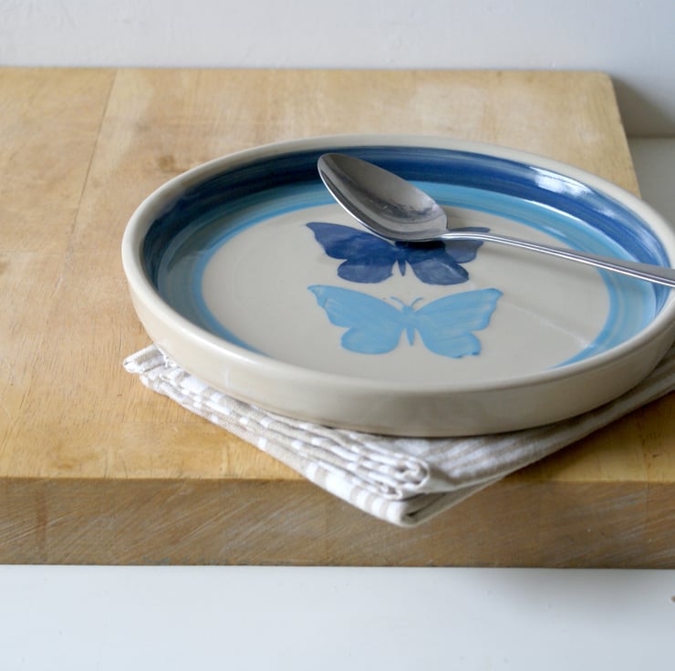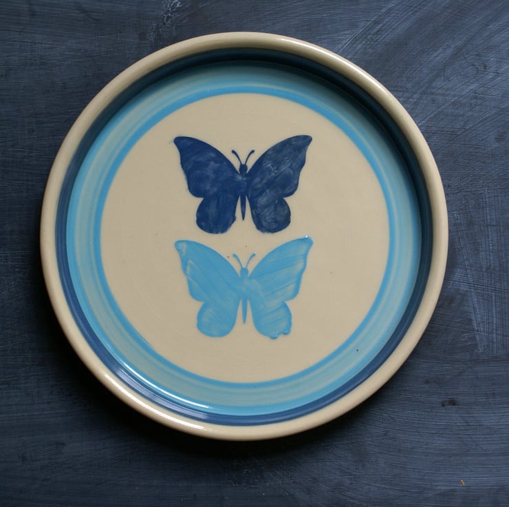 Hand thrown on my potters wheel this stoneware plate features a summertime butterfly motif. The flat plate has a shallow sided ledge and has been glazed in a glossy transparent to allow the slip decoration to show through. The butterflies have been hand painted on the surface in navy and pale blue. This plate would make a beautiful handmade addition to your kitchen serving bread rolls and maybe a piece or two of cake at lunchtime!