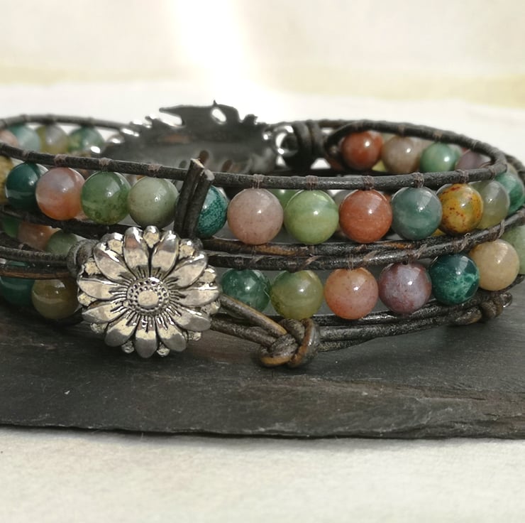 This bracelet features semi precious rainbow jasper beads in a mix of soft, earthy colours. Rainbow jasper nurtures, balances energies, promotes positive transformation, enhances grounding, stimulates creativity and instills joyful optimism.