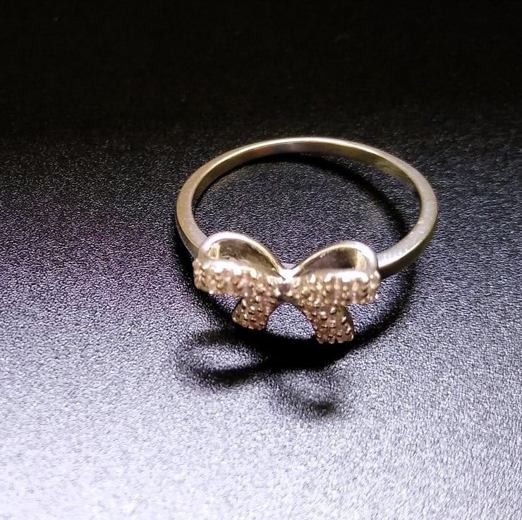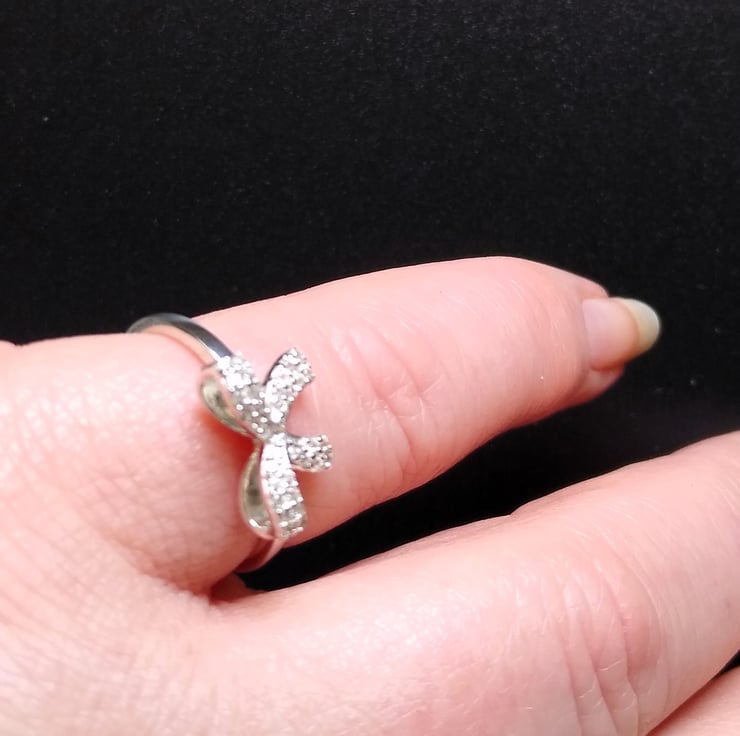 A beautiful gemstone encrusted 925 sterling silver 3D bow design ring. Encrusted with 34 genuine 1mm Zircon semi precious gemstones.