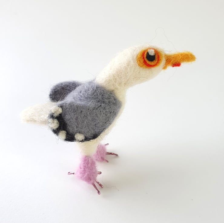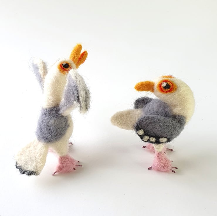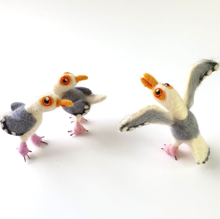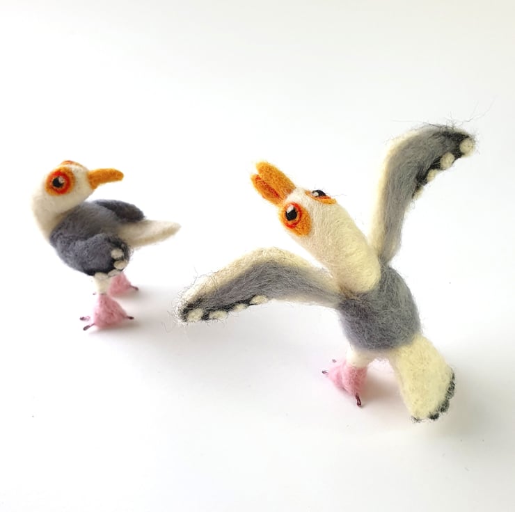 Made from Merino wool and needle felted on to a wool bead with wire threaded through for legs, Seagulls are approx 6cms tall from toe to top of head and constructed around a 2 cm diameter felt bead. This cheeky flappy chappy has pale pink feet!