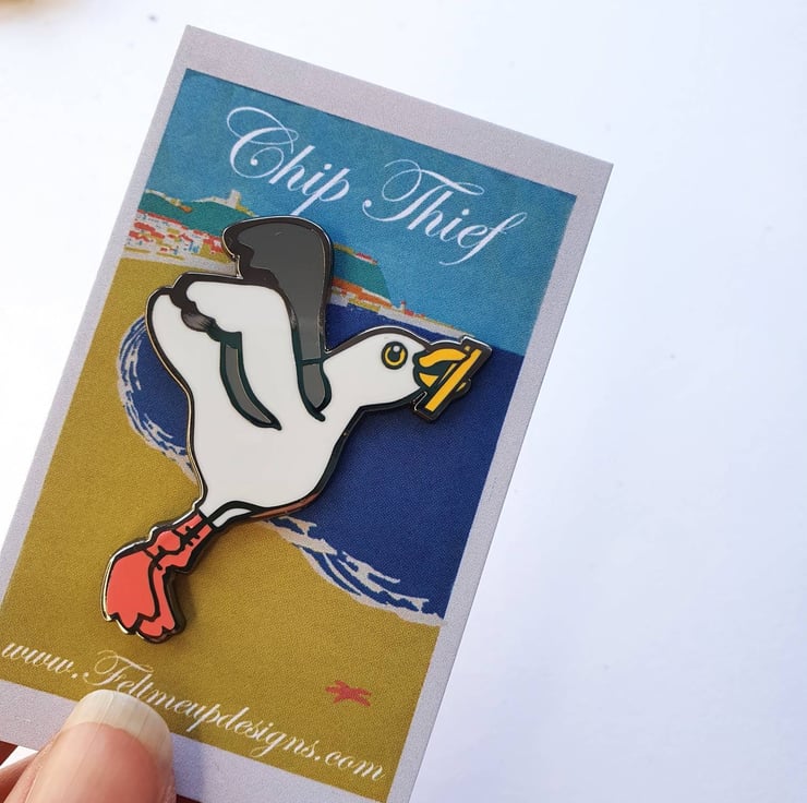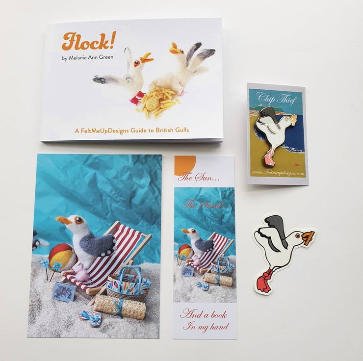 A lovely seagull gift set including book, sticker, enamel chip thief seagull pin, bookmark and post card.