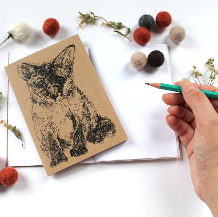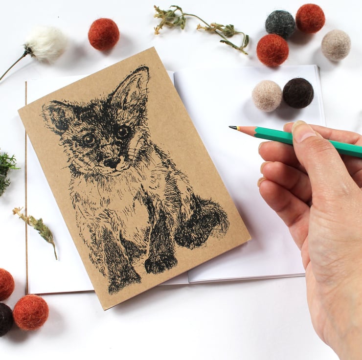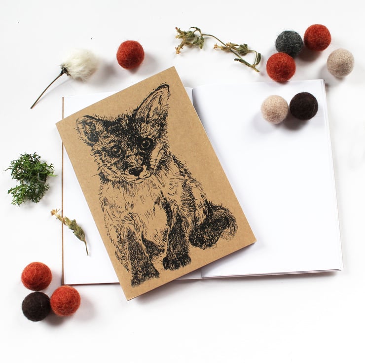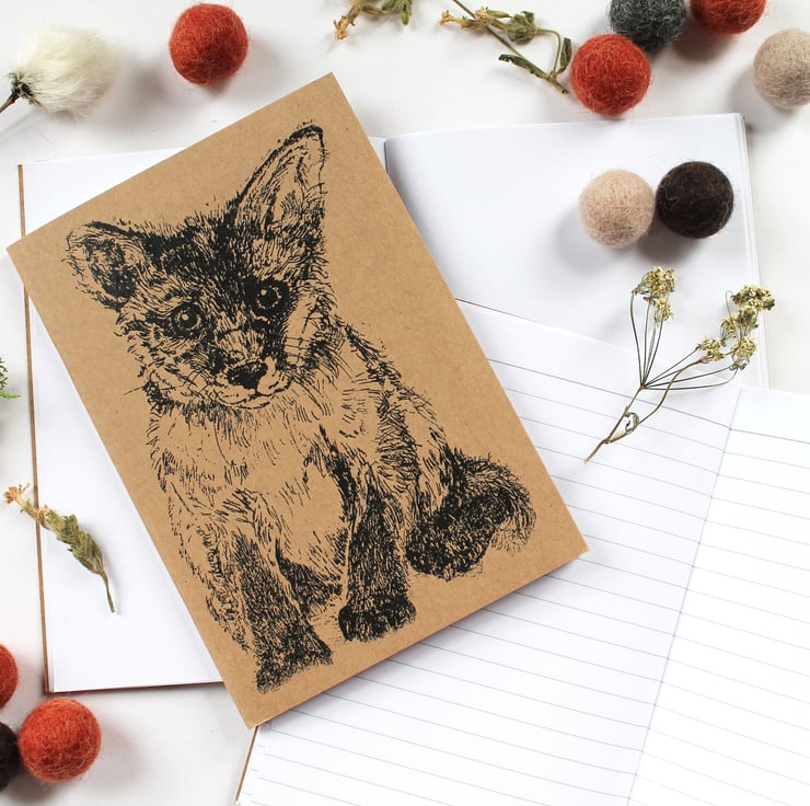 Baby Fox notebook. A cute fox printed on a slim and sturdy note book with 48 blank pages made from recycled paper for all your thoughts, doodles and musings!