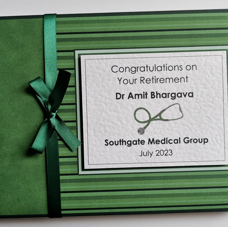 This Retirement Guest Book is decorated with embellishments and a ribbon.