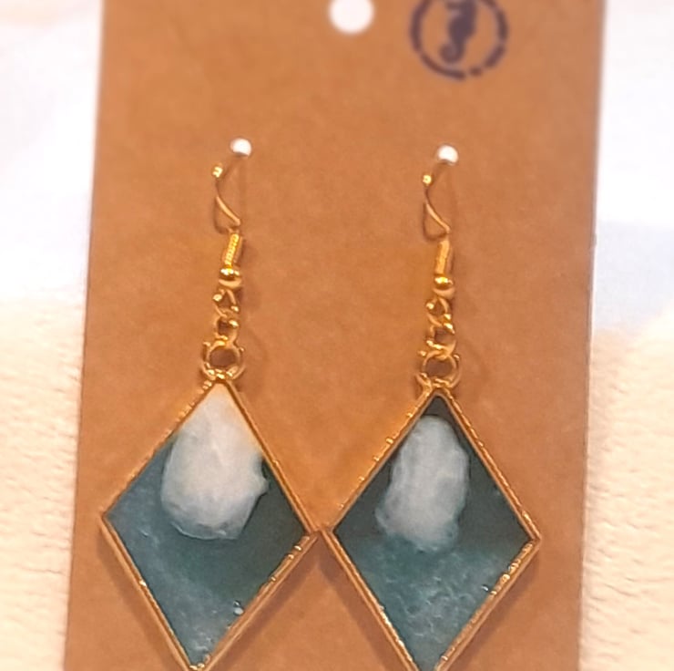Diamond shaped drop earrings filled with blue and white resin to resemble breaking waves.