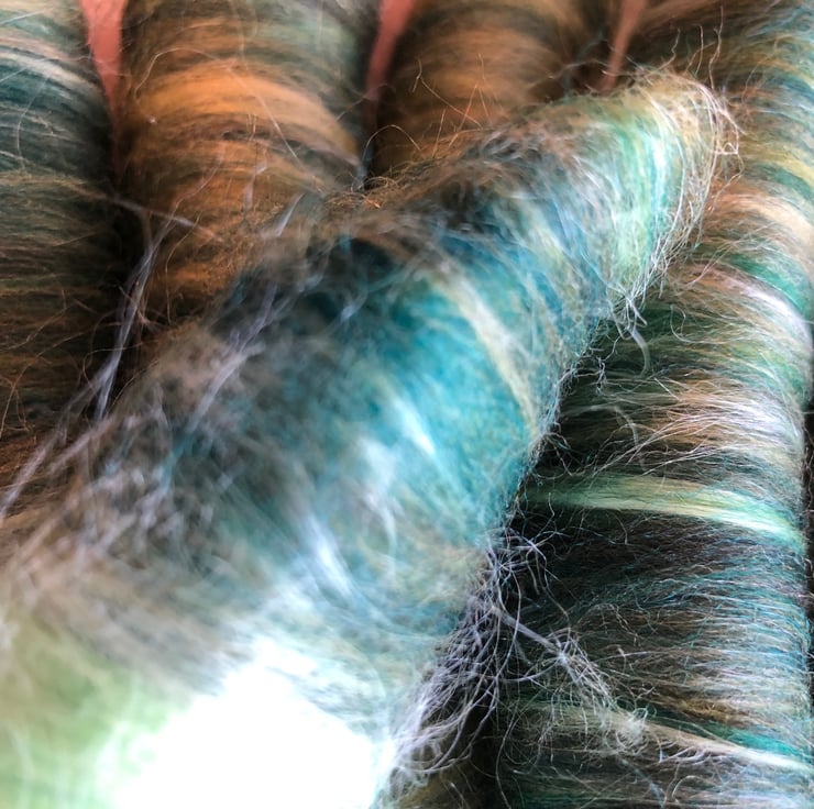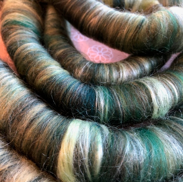 The fibre base is a mixture of all natural fibre (78%) and banana fibre (22%). so if you haven't spun with it before it is unexpectedly smooth. I thought it would lend itself well to spinning from rolags.