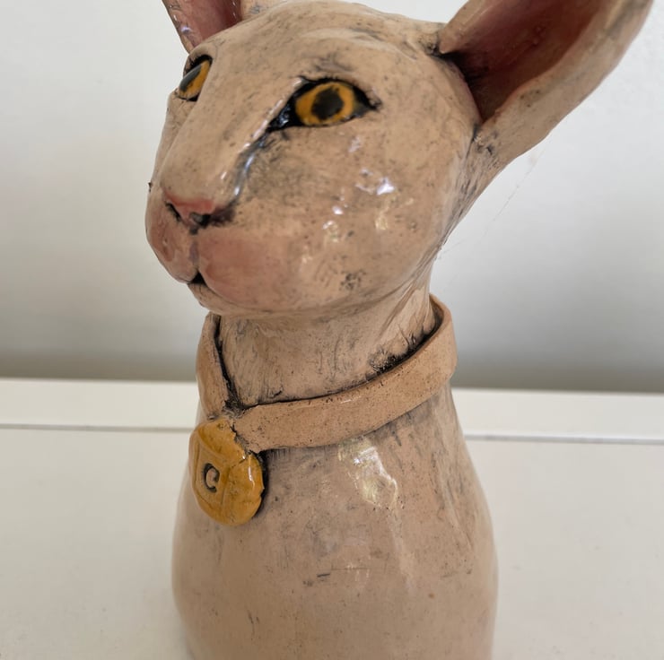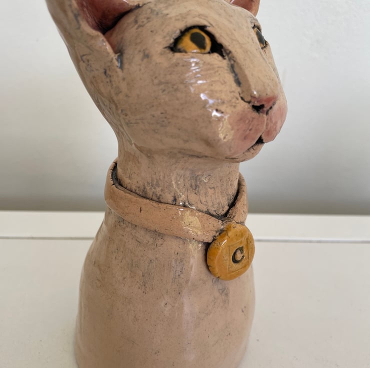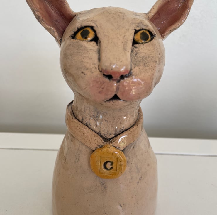 C for cat! This character is inspired by the Egyptian no hair cats. I gave him a collar too. Made using coiling and pinching techniques. Then fired and glazed and fired again after hand painting. Approx 16 cm high.